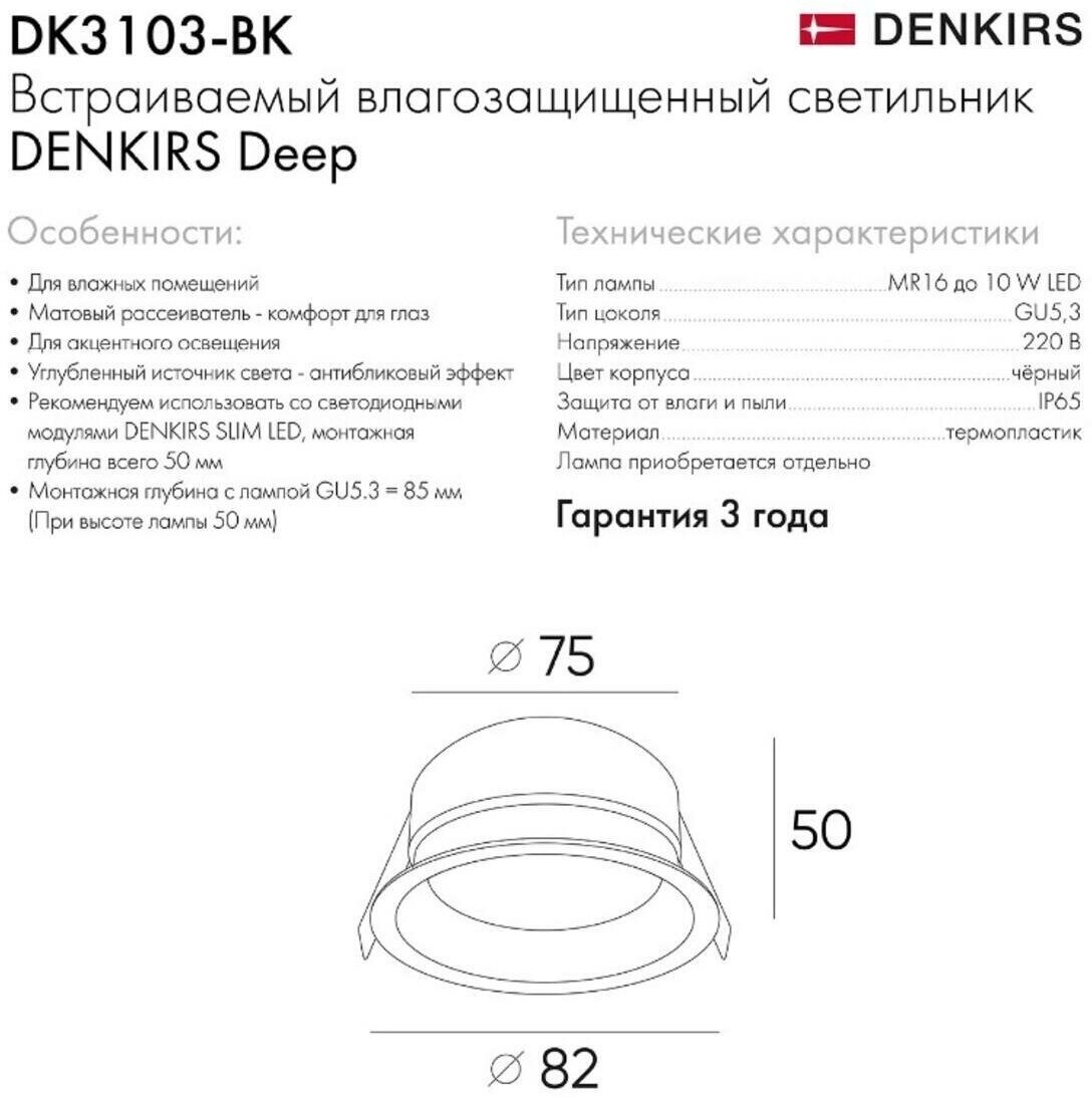 Светильник потолочный встраиваемый, влагозащищённый DENKIRS DK3103-BK, IP 65, 10 Вт, GU5.3, LED, черный, пластик 1 240 ₽
