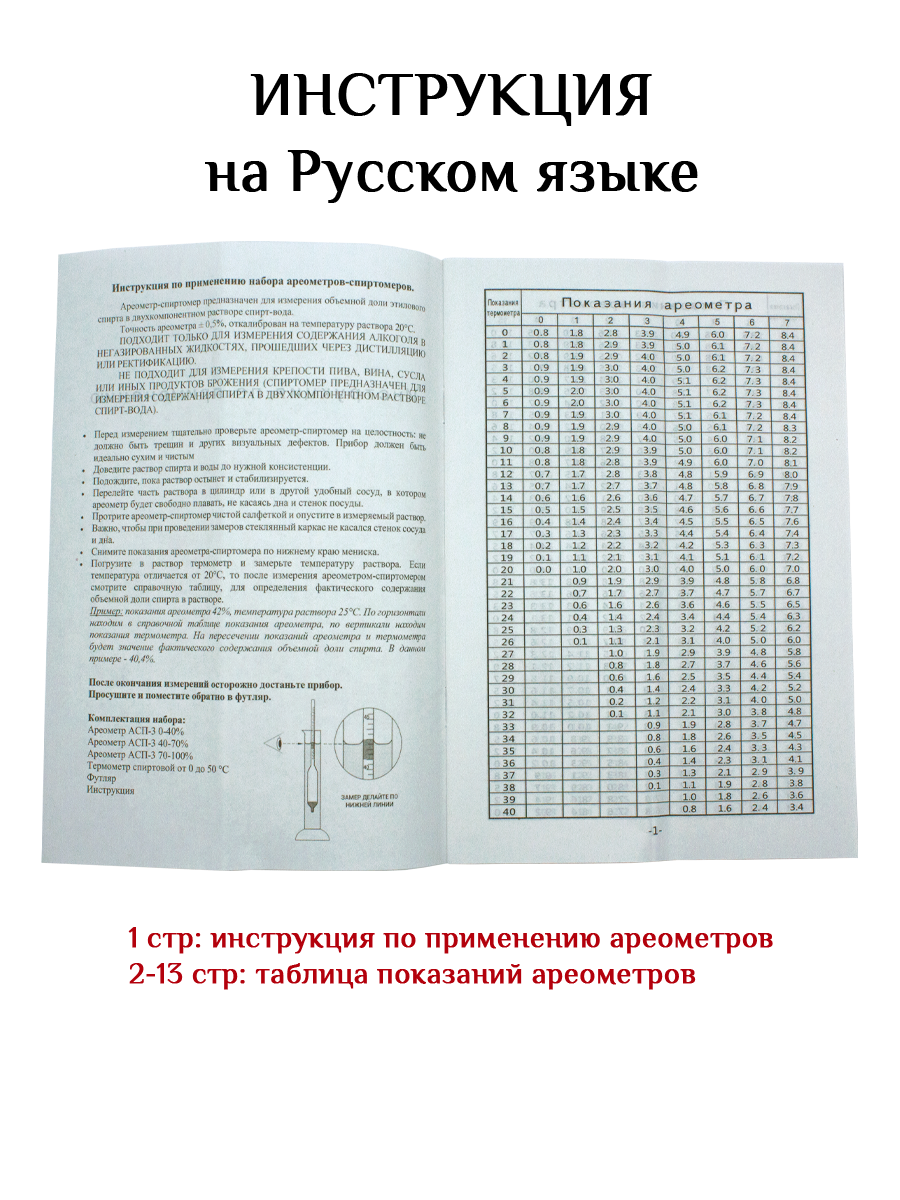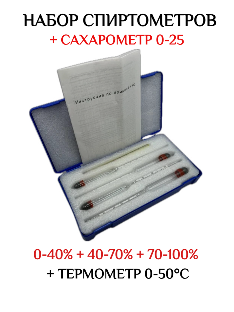 | Подробная комплектация | ареометры для спирта 0-40%, 40-70%, 70-100%, термометр жидкостной 0-50С, Инструкция, футляр |