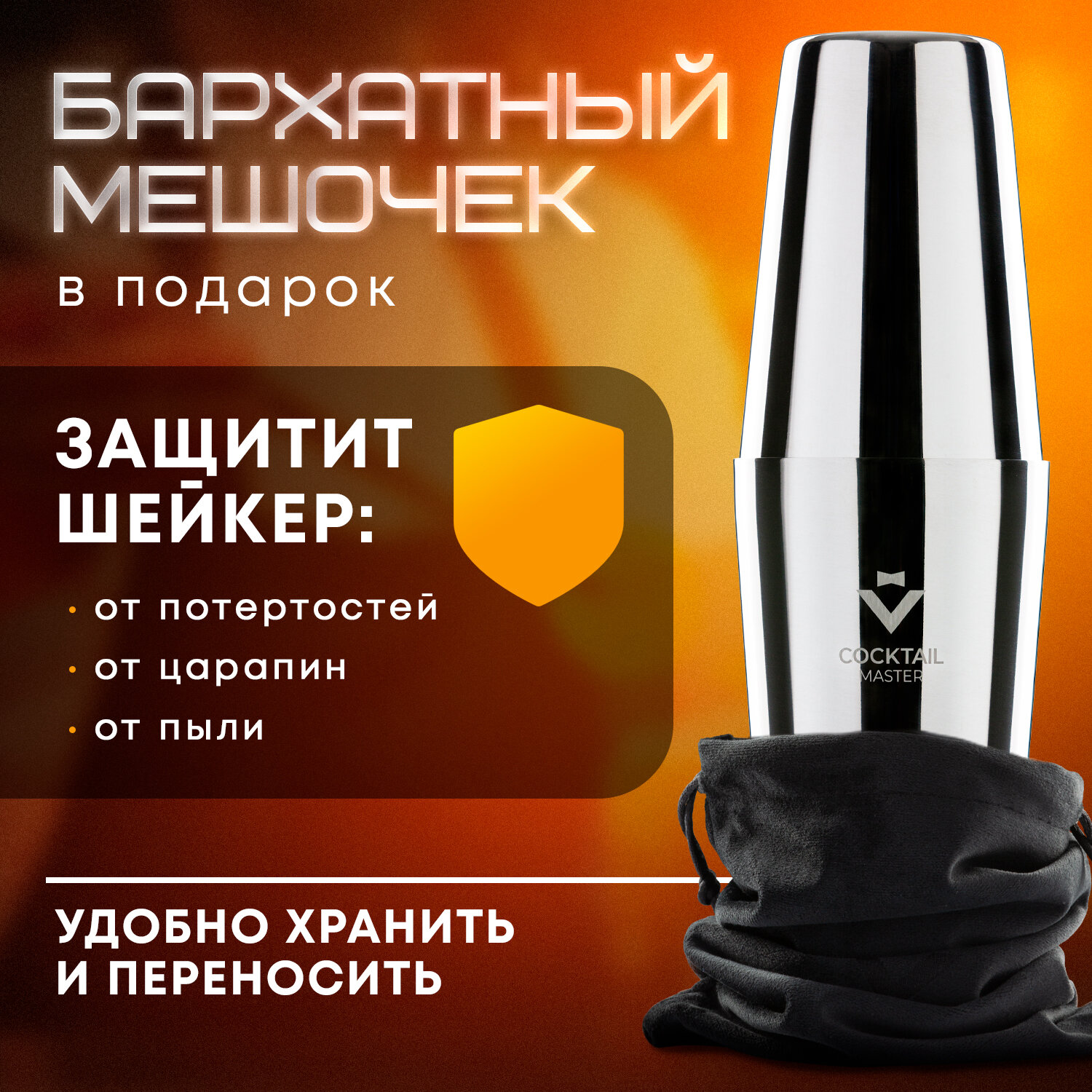 | Подробная комплектация | Шейкер Бостонский включает 2 стакана 750 и 600 мл. и бархатный мешочек для хранения и переноски. |