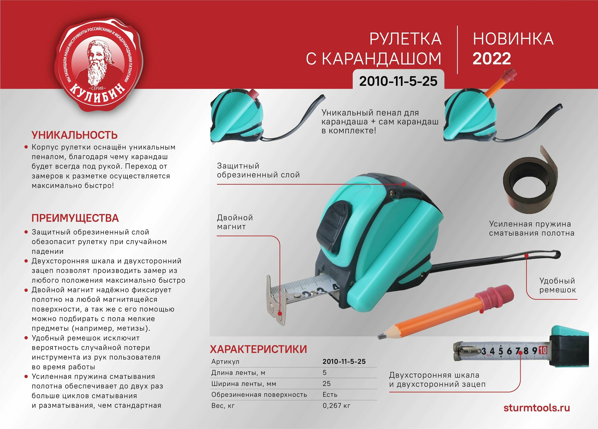 Рулетка 5x25мм, с карандашом, обрезиненная, 2-ст. зацеп,магнит,Кулибин,pat.,Sturm! 2010-11-5-25 информация:
