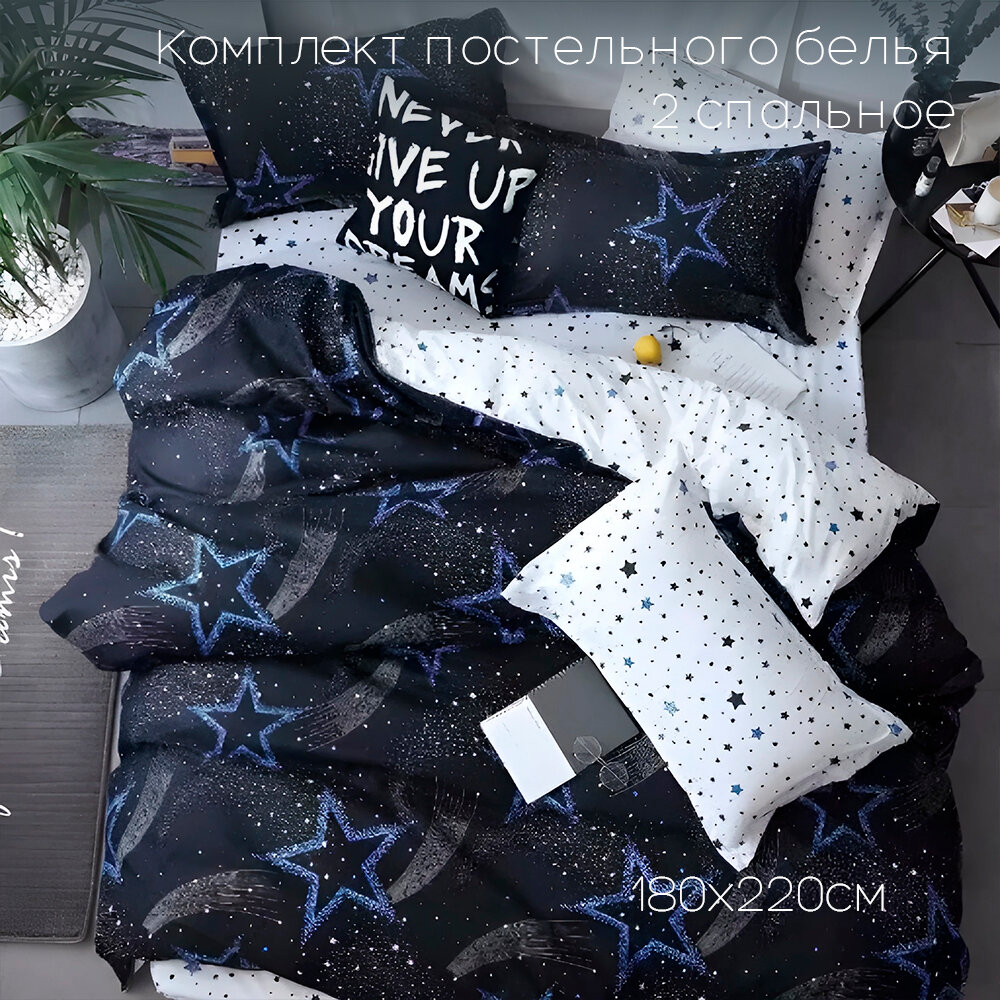 Постельное белье Сатин 2 спальный с простыней на резинках по углам Наволочки 70x70 Хлопок Aimee SAYA HOME Звезды.