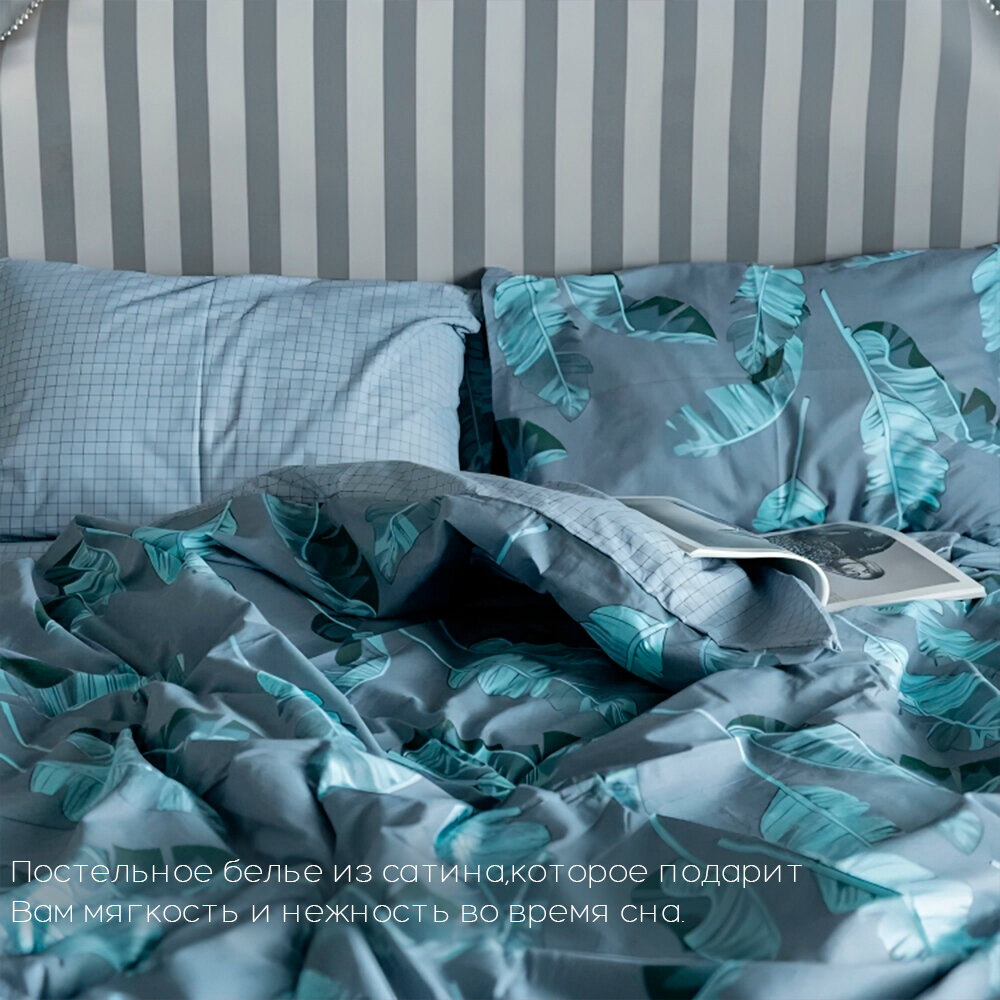 Постельное белье Сатин 2 спальный с простыней на резинках по углам Наволочки 70x70 Хлопок Aimee SAYA HOME Синий. Серый. 2 190 ₽