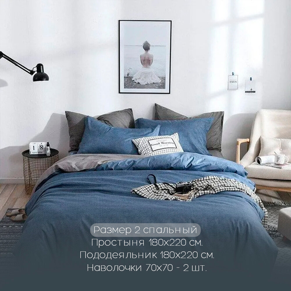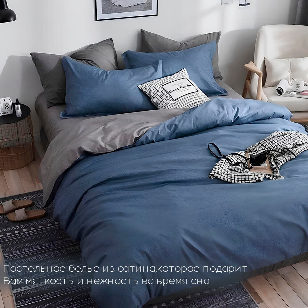 Постельное белье Сатин 2 спальный с простыней на резинках по углам Наволочки 70x70 Хлопок Aimee SAYA HOME Синий. Серый. информация: