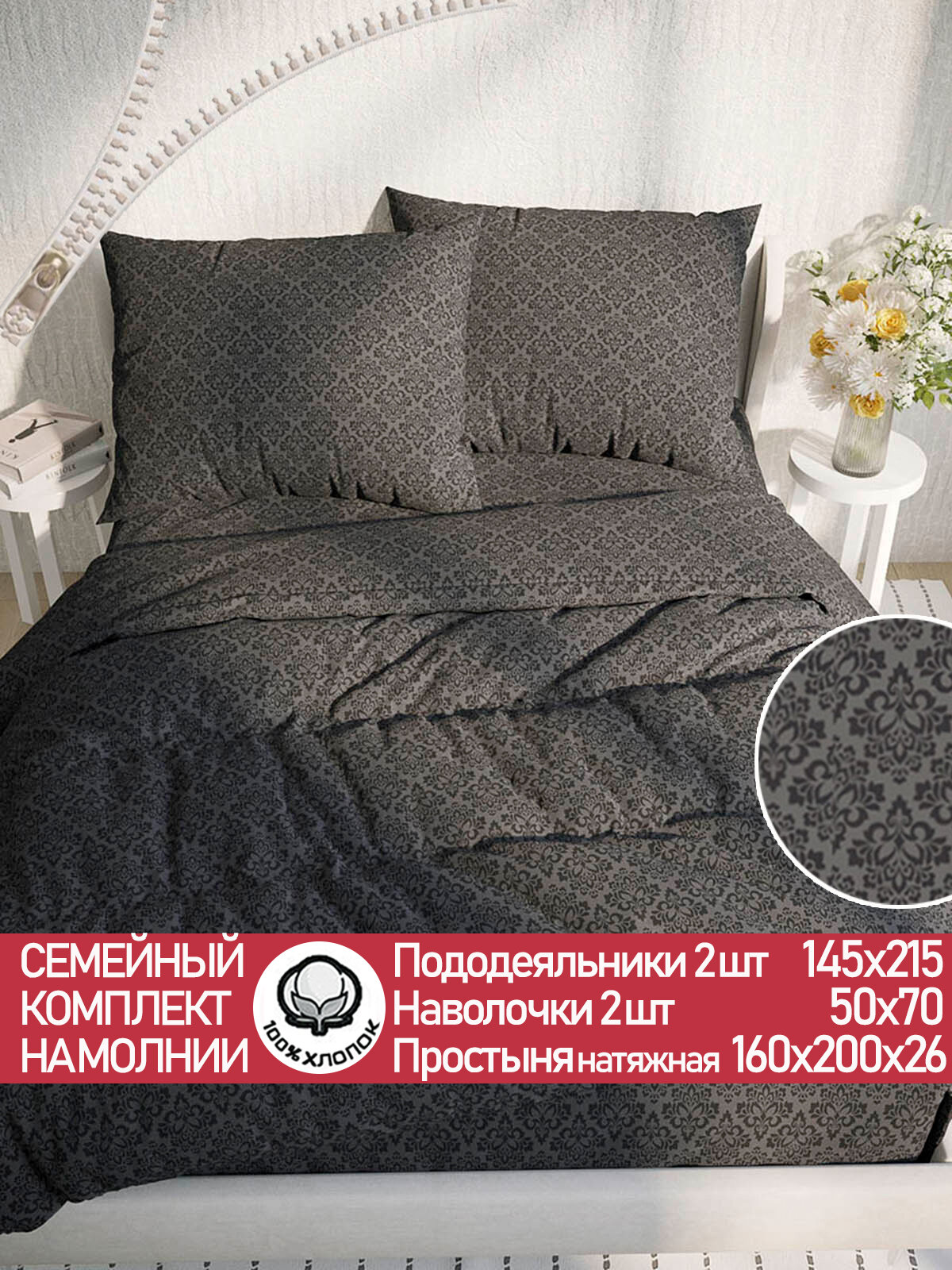 Отзывы на Постельное белье Cказка "Классика (черная)" семейное Пододеяльник 145х215 см(2шт) наволочки 50х70 2шт Простынь на резинке 160х200 см