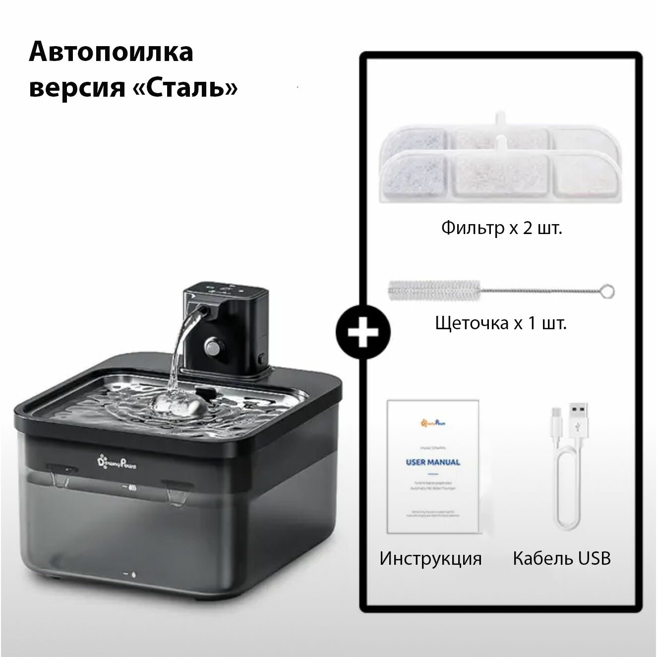 | Подробная комплектация | Поилка пластик, аккумулятор, фильтр 2 шт., инструкция |
