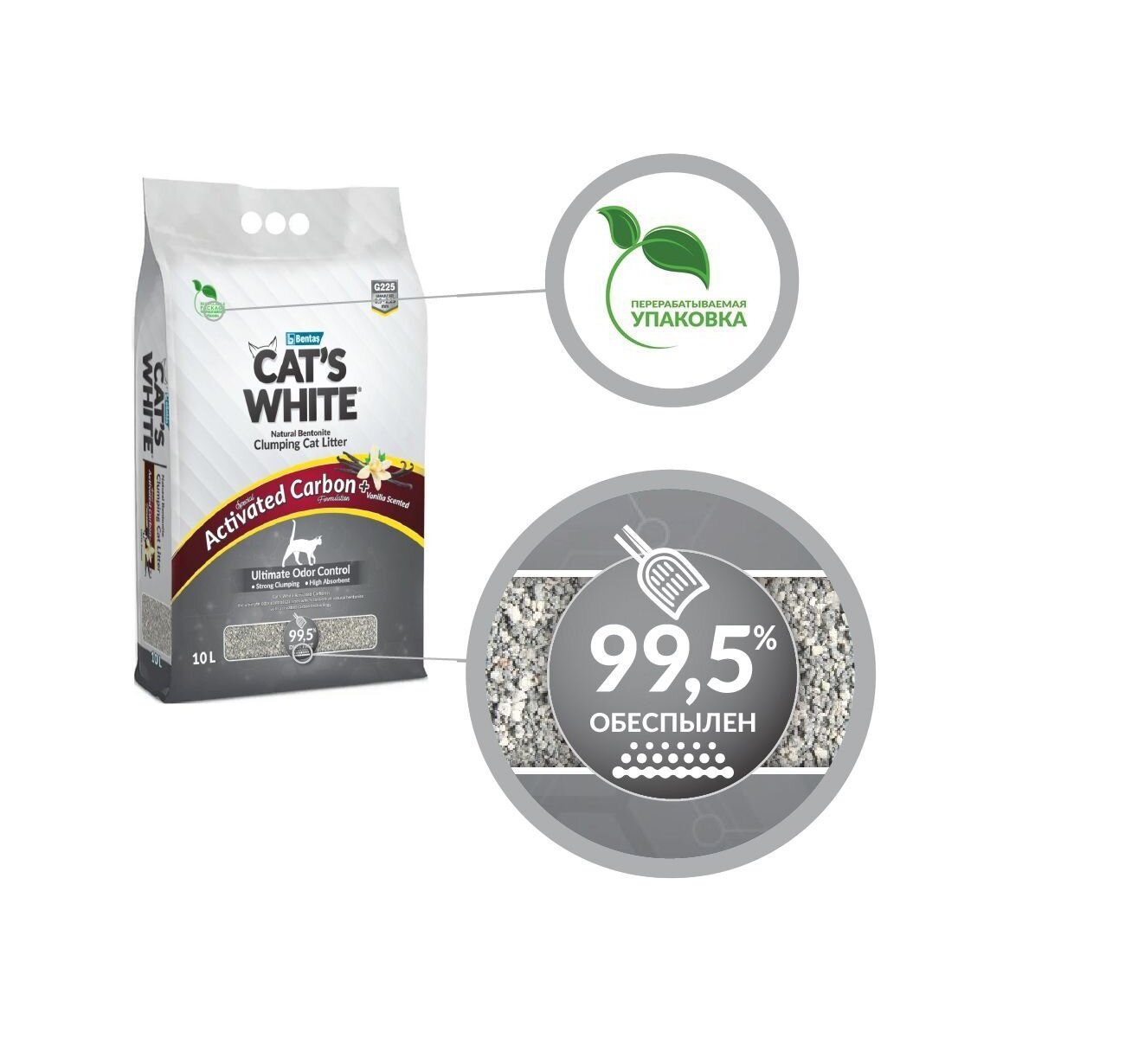 | Дополнительная информация | с активированным углем; без ароматизатора; натуральная бентонитовая глина; обеспылен на 99,5%; комкуется за 5 секунд; для нескольких кошек |