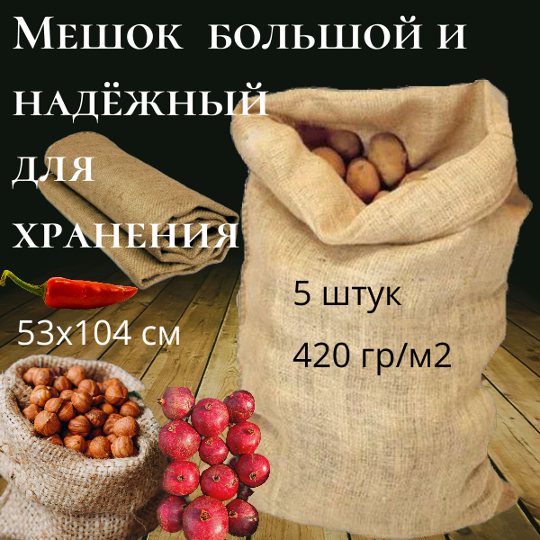 Мешок джутовый 53х104 см большой, 5 шт, плотный 420 гр/м2 ГОСТ для картошки, овощей и фруктов информация: