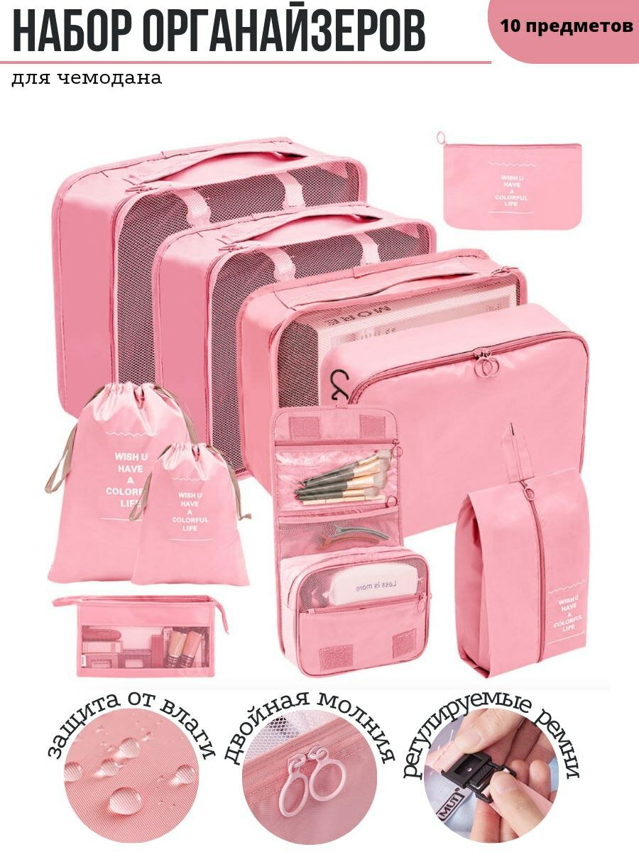10 цен на Дорожный набор/ Органайзер для хранения вещей в чемодане розовый 10 шт.