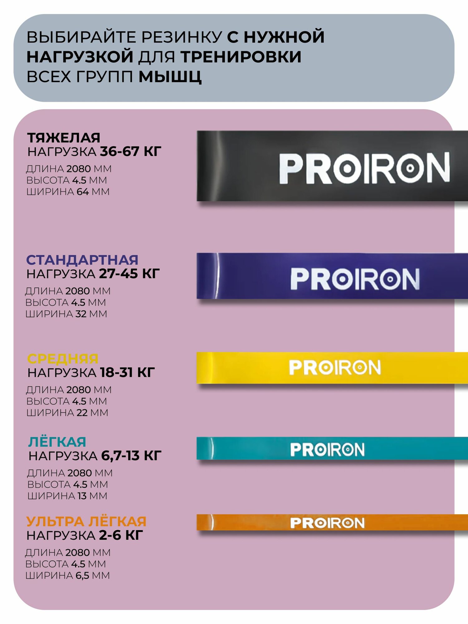 Резинка для фитнеса, PROIRON, нагрузка 27-45 кг, 2080х35х4,5 мм, фиолетовый 1 299 ₽