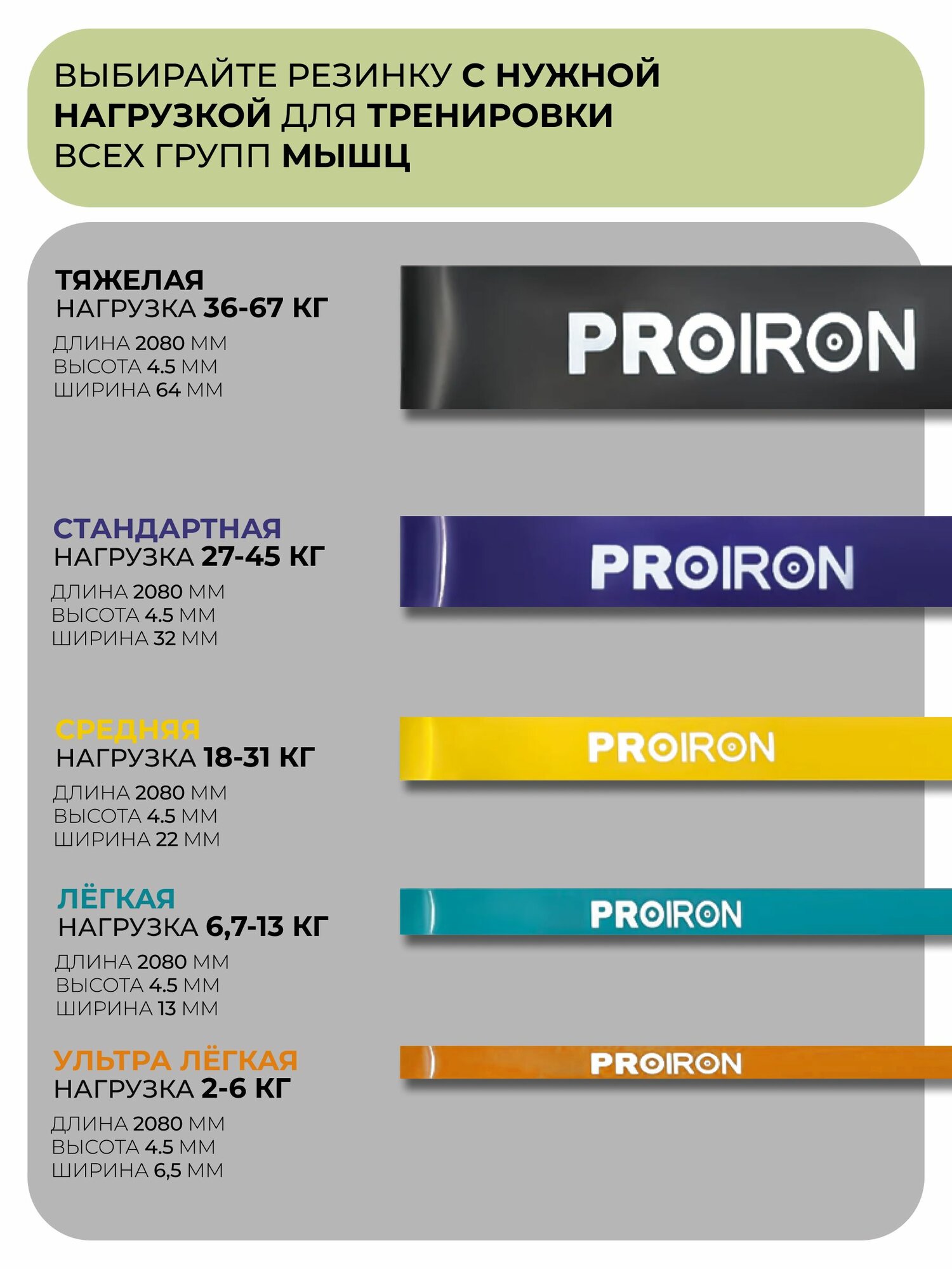 Резинка для фитнеса, PROIRON, нагрузка 36-67 кг, 2080х64х4,5 мм, черный 2 399 ₽
