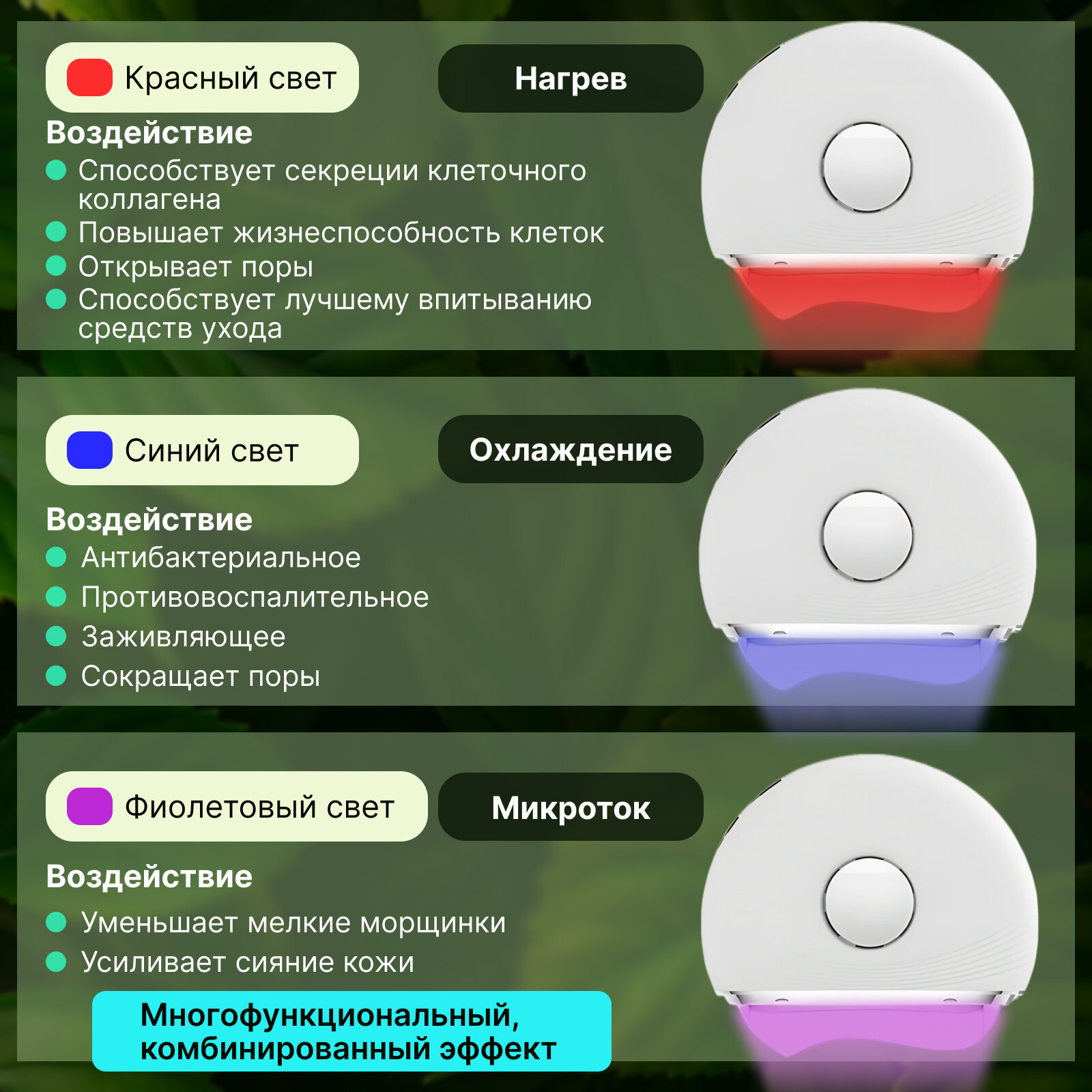 Дополнительная информация | Красный свет: горячий массаж открывает поры и способствует лучшему впитыванию средств по уходу за кожей, а вибрация усиливает эффект горячего массажа. Синий свет: Холодный массаж и вибрация сокращает поры, делая кожу более гладкой и упругой, а также повышает эластичность кожи. Фиолетовый свет: микровибрация и микроток для подтяжки и лифтинга кожи. |