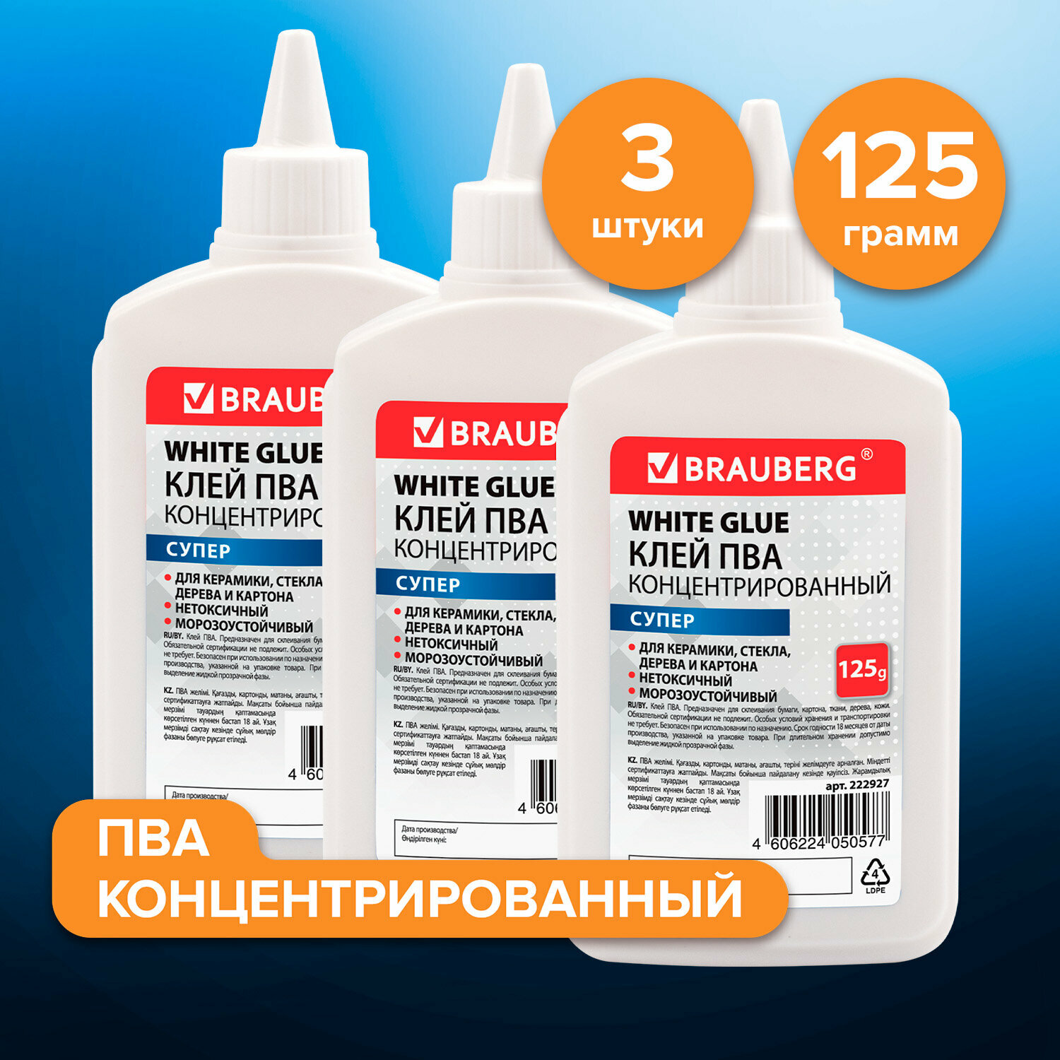 Клей пва-супер комплект 3 штуки*125 г. универсальный, выгодная упаковка, BRAUBERG, 880141 информация: