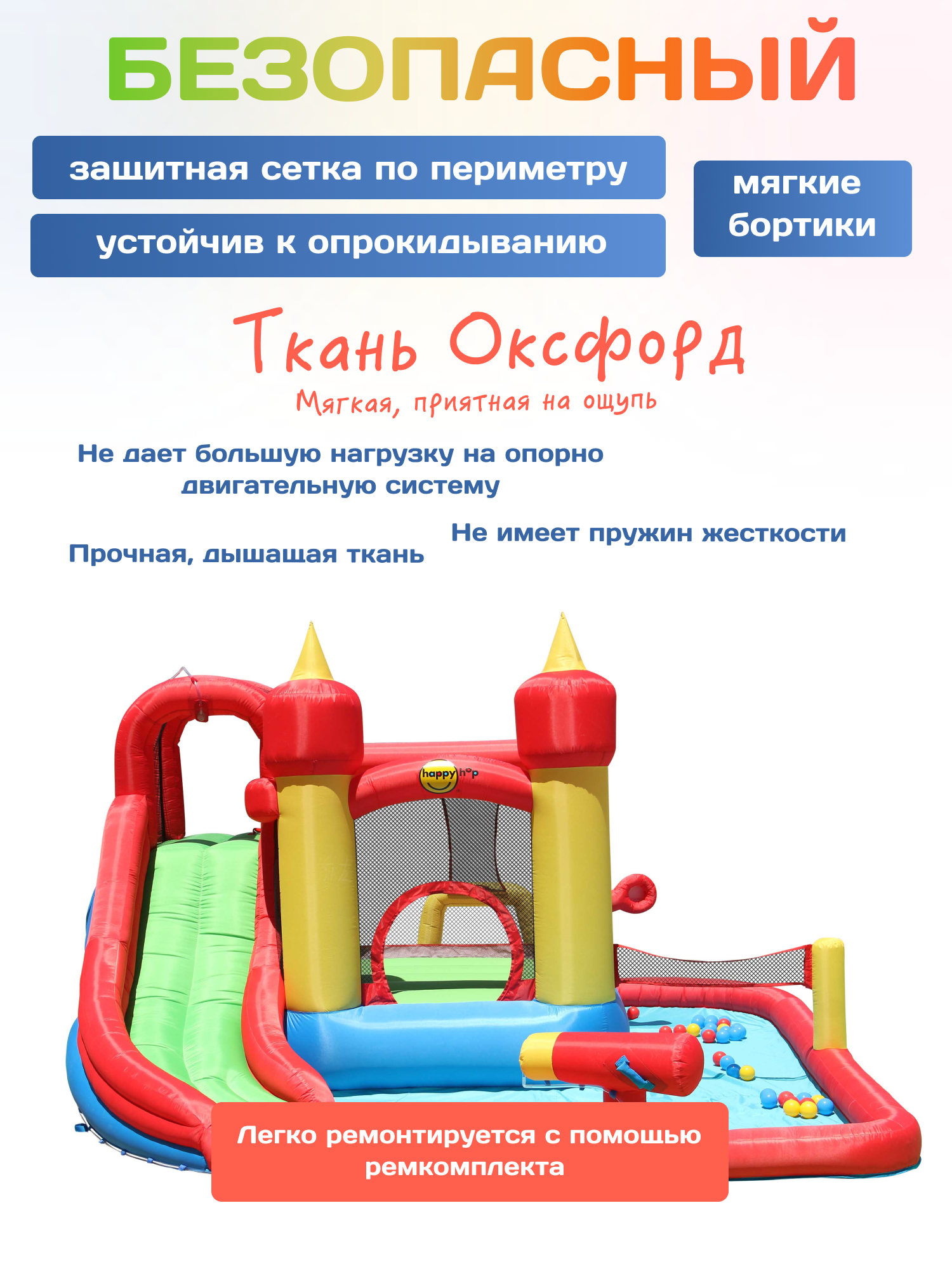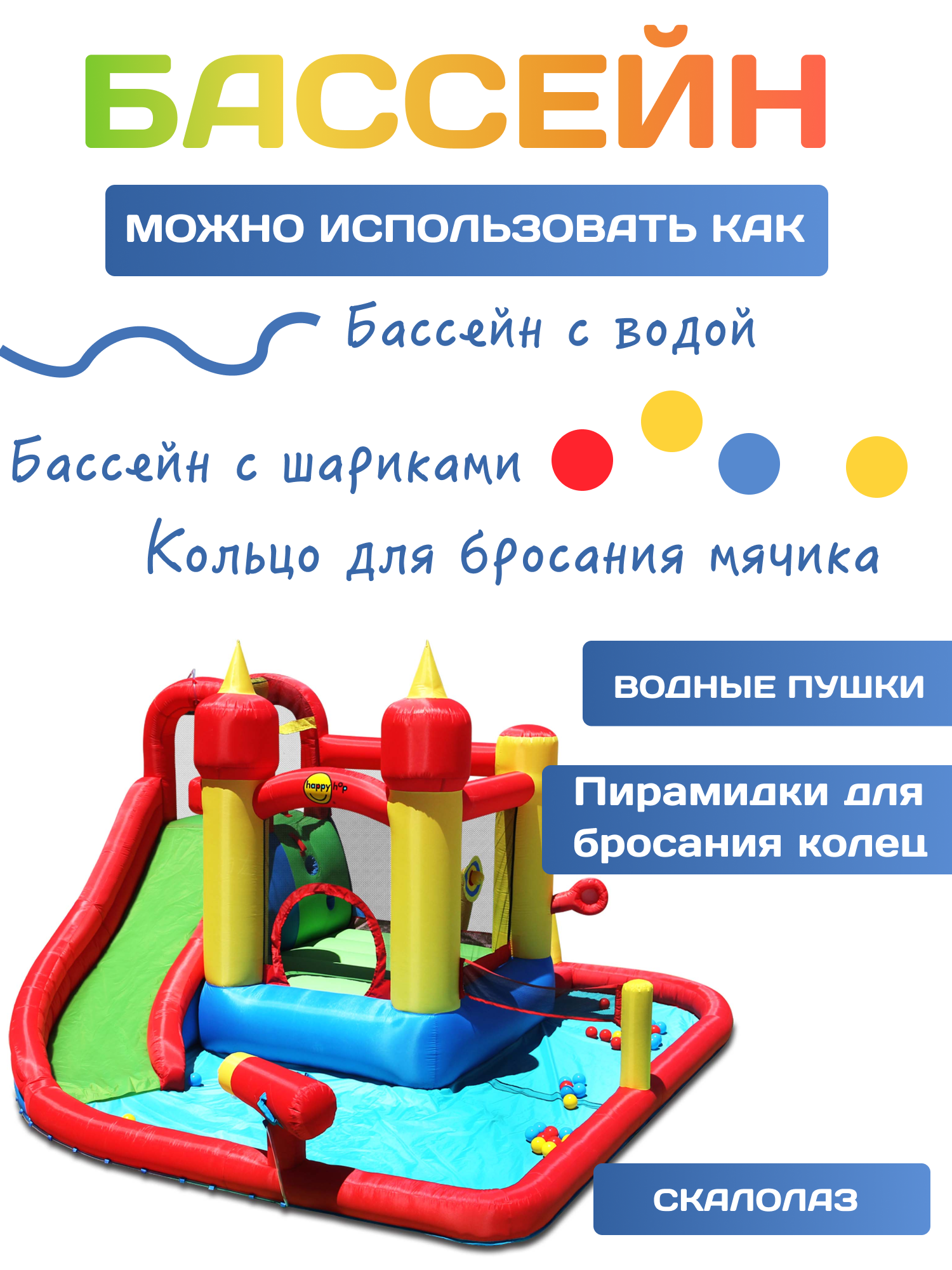 | Комплектация | Надувной батут, насос, колышки для крепления к земле, пластиковые шарики, ремкомплект, сумка для хранения и перевозки, инструкция, трубки для подведения воды, шарики с липучкой |