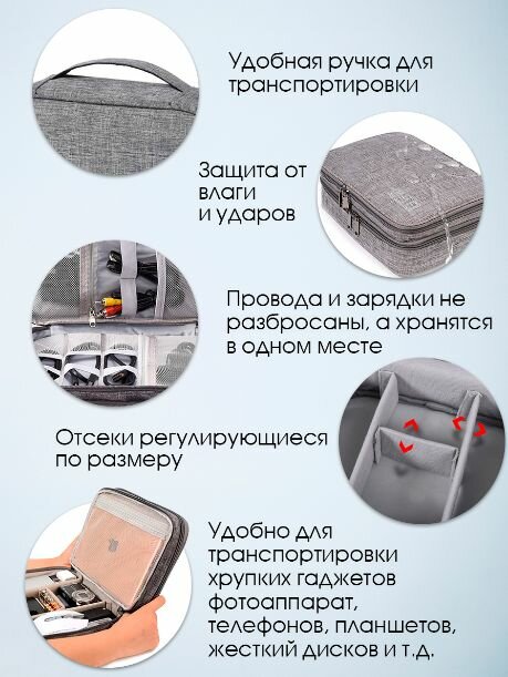 Органайзер для аксессуаров и проводов HaBe (Серый), держатель для проводов, зарядок, кейс, на молнии 720 ₽