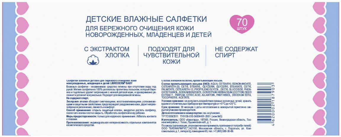 Детские влажные салфетки для очищения кожи новорожденных, младенцев и детей, 70 шт, LIBREDERM информация: