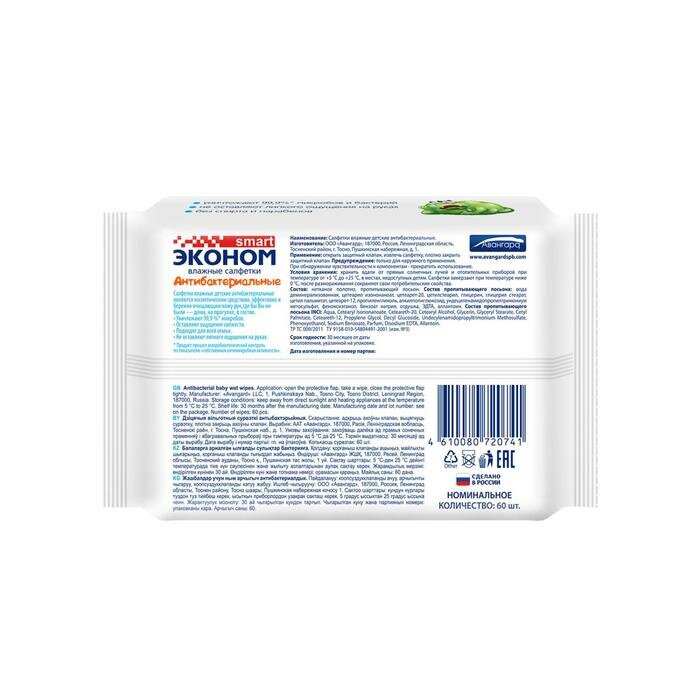 Влажные салфетки «Эконом Smart», детские антибактериальные, 60 шт. информация: