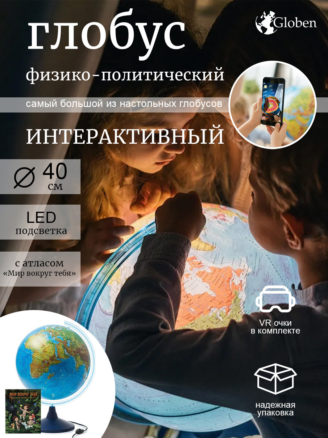 Globen Интерактивный глобус Земли физический-политический диаметр 40 см., с LED-подсветкой + Атлас + VR очки информация: