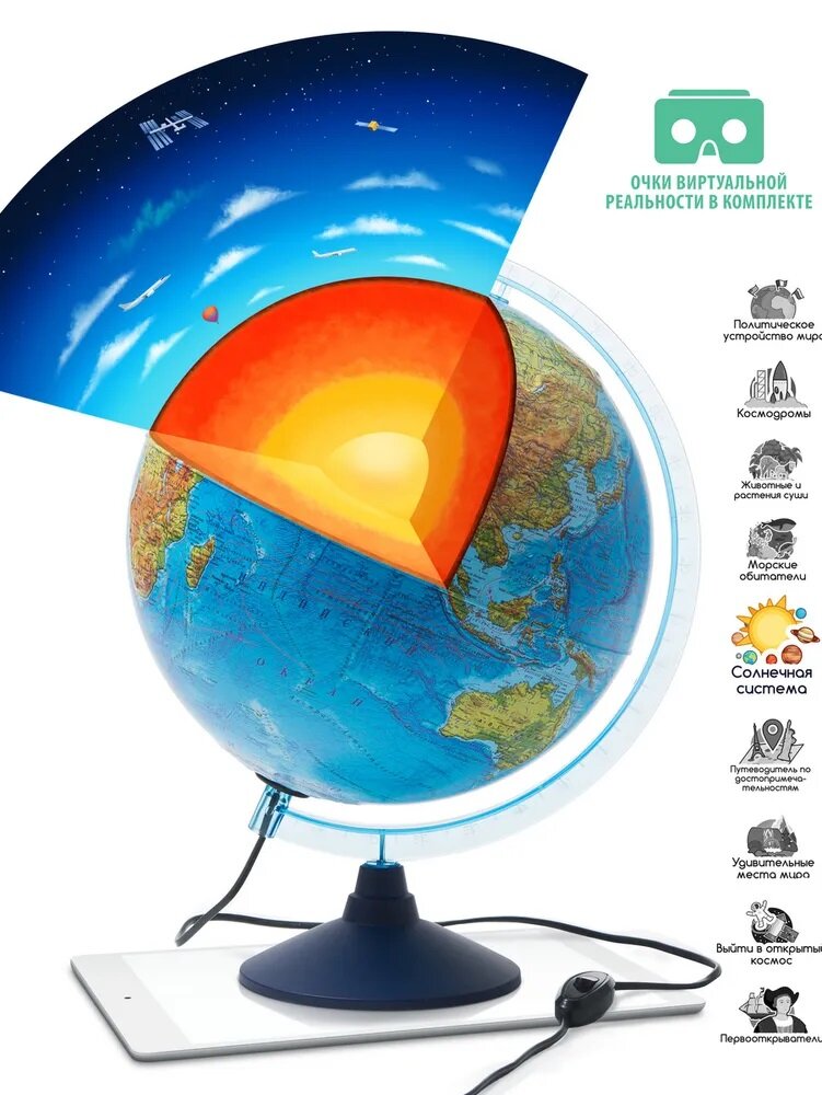 10 цен на Globen Интерактивный глобус Земли физический-политический диаметр 40 см., с LED-подсветкой + Атлас + VR очки