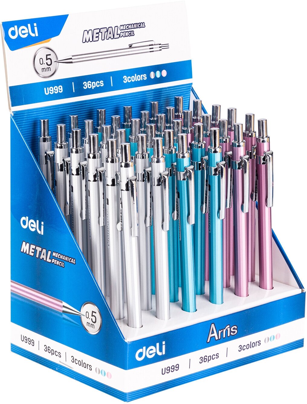 Набор из 36 штук Карандаш механический Deli EU999 Arris 0.5мм металл ассорти дисплей ластик информация: