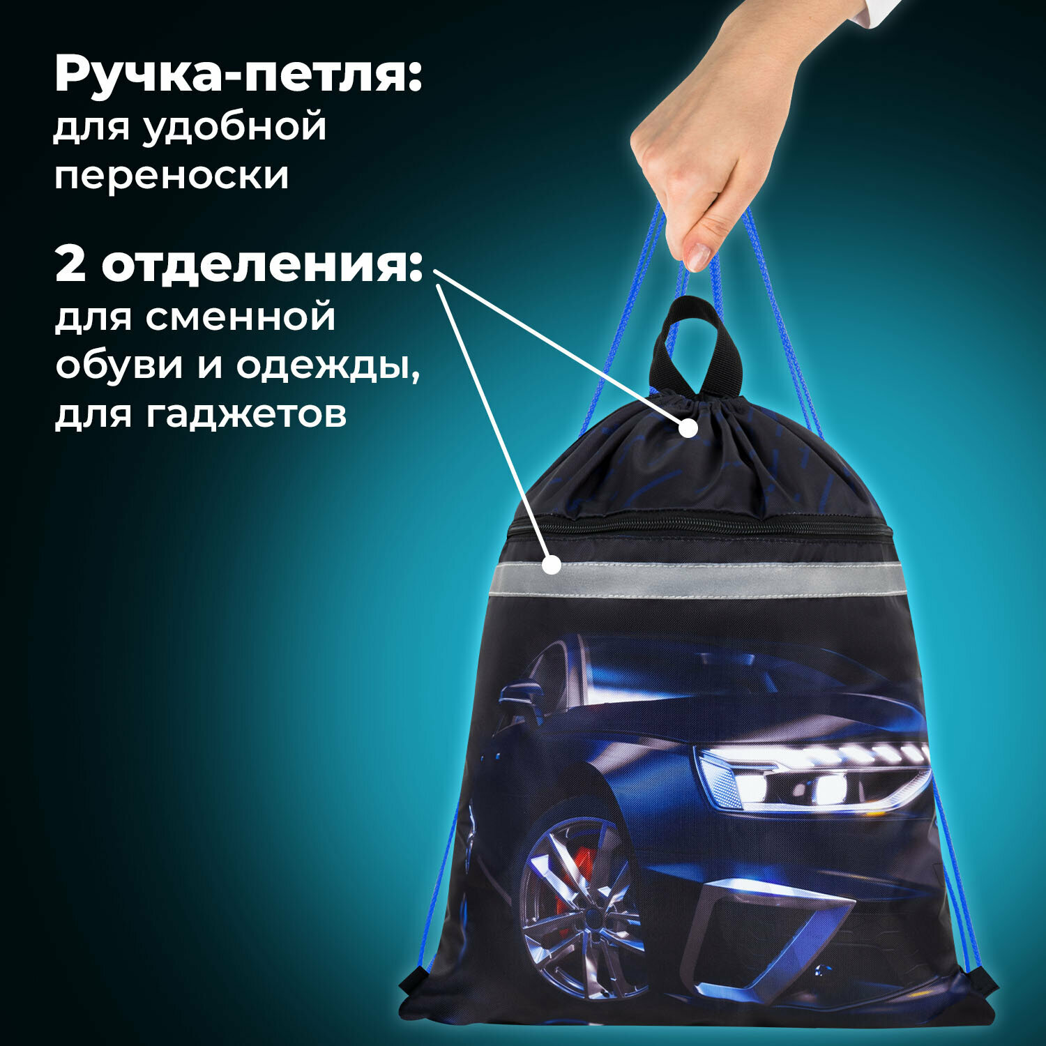 Мешок для обуви Brauberg, с петлей, светоотражающая полоса, 2 отделения, 46х36 см, Super car, 272397 информация: