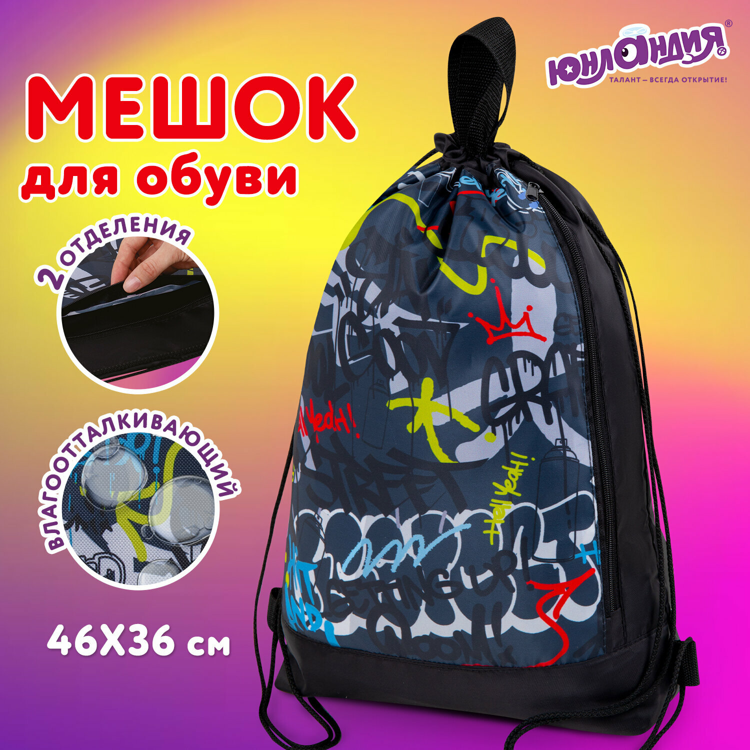 Мешок для обуви для мальчика, сумка для сменки в школу, чехол детский плотный с ручками, боковым карманом на молнии 46х36см, Юнландия Graffiti, 272408 информация: