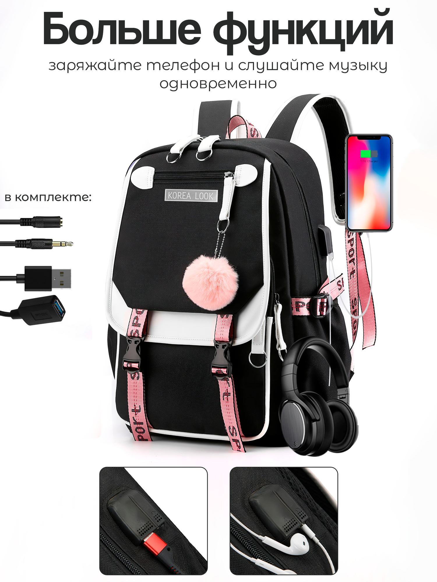 Городской школьный рюкзак с помпоном для учащихся (Черно-белый) информация: