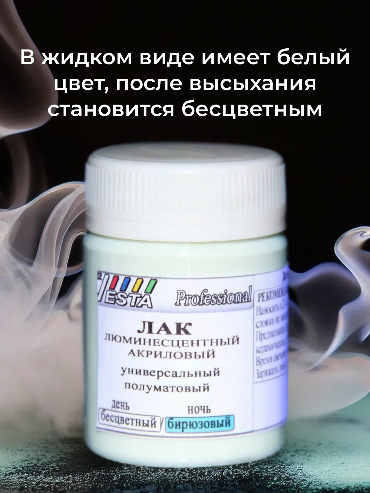 Лак люминесцентный "VESTA PROFESSIONAL" бесцветный / бирюзовый (день / ночь) - 30 мл информация: