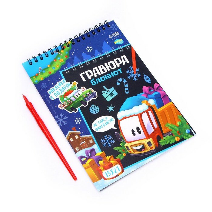 Блокнот - гравюра на новый год «Транспорт», 10 листов, лист наклеек информация: