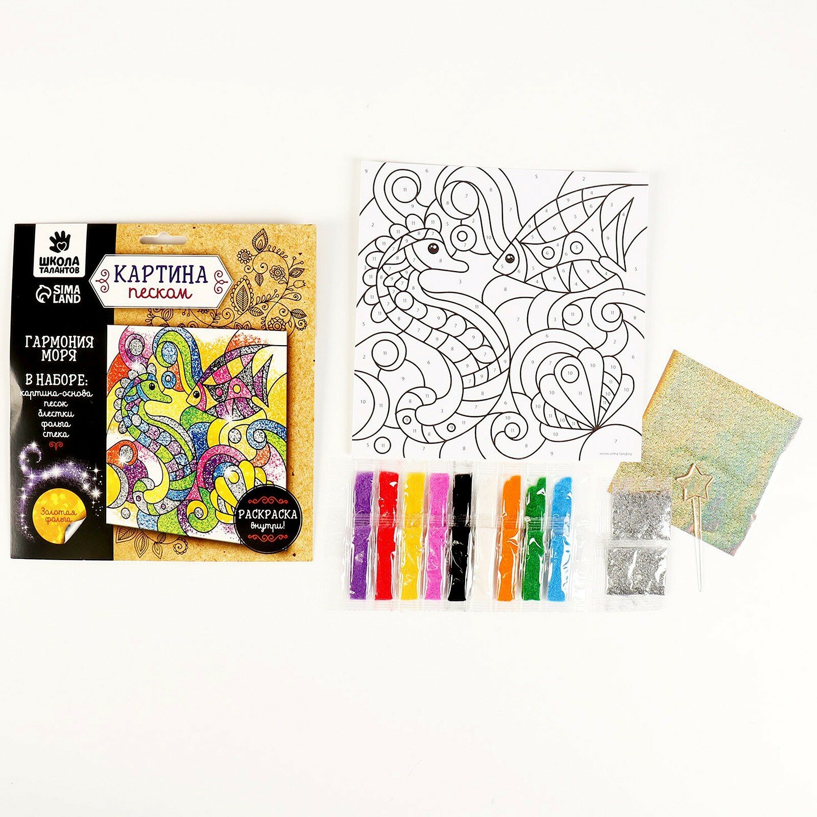10 цен на Фреска песком "Морской дуэт" + 9 цветов песка по 4 гр, блёстки, стека 1шт.
