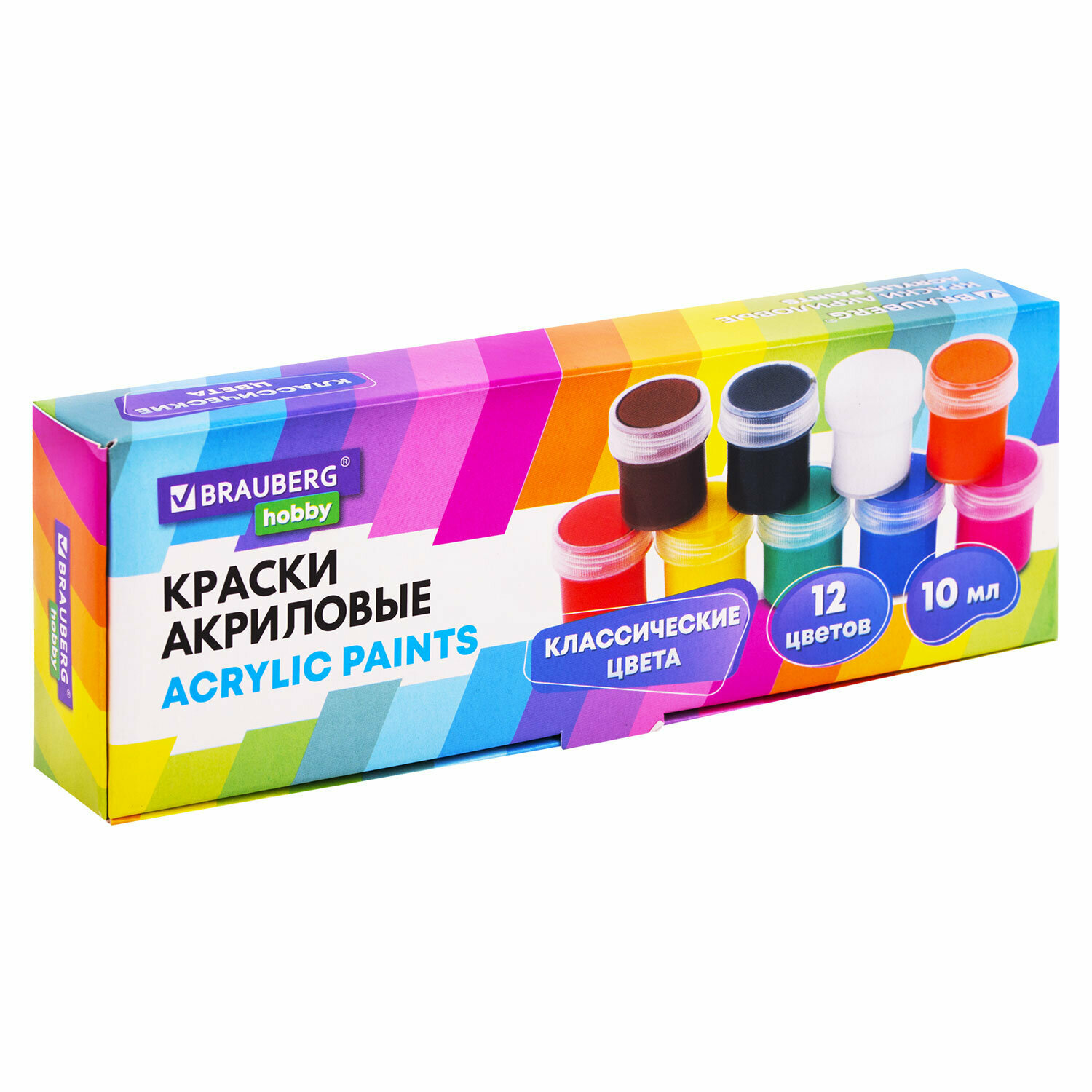 Краски акриловые набор для рисования и творчества, 12 цветов по 10 мл, Brauberg Hobby, 192433 информация: