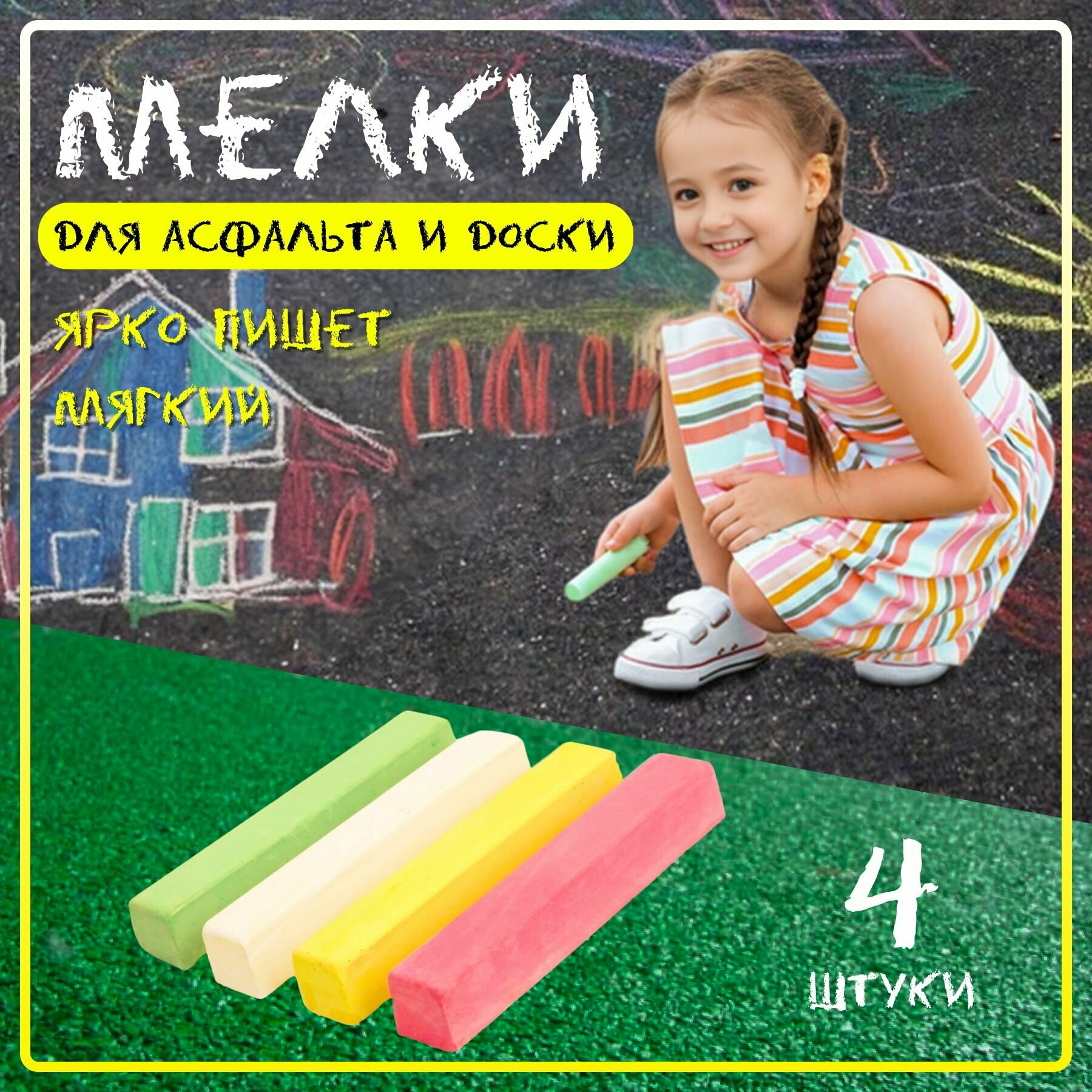 Цветные мелки для рисования на асфальте, 4 цвета, 4 штуки информация:
