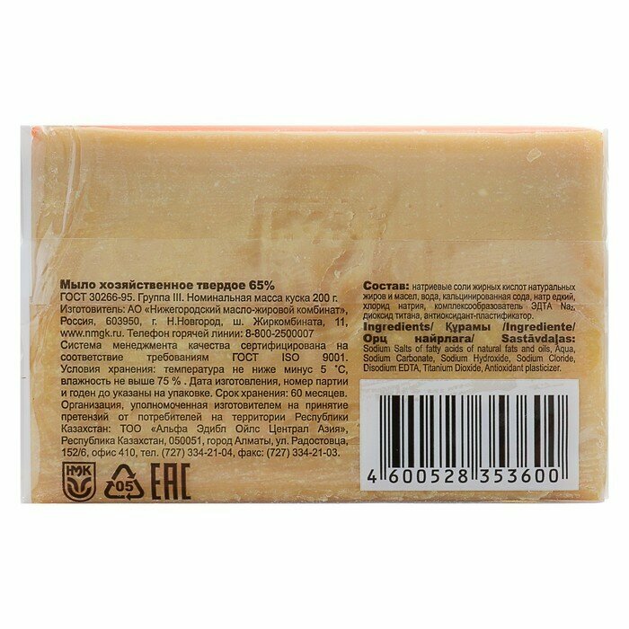 Московский мыловаренный завод Мыло хозяйственное ГОСТ - 30266-2017 65% 200 г./В упаковке шт: 60
