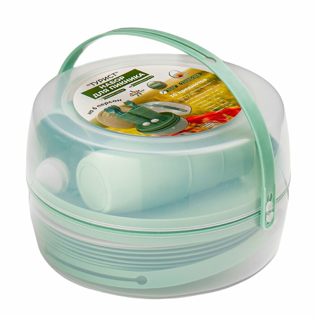 | Дополнительная информация | набор для пикника на 6 персон, включает 30 предметов, легкий и удобный в использовании, экономичный, выполнен из качественного и прочного пластика, предназначен для сервировки столов в любых условиях, посуда свободно помещается в контейнер с ручкой для удобства переноски, изделия из пластика составляют достойную конкуренцию товарам из дерева, железа и стекла |