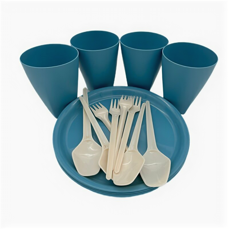 Отзывы на Набор для пикника на 4 персоны сине-серый (тарелка, стакан, ложка, вилка)