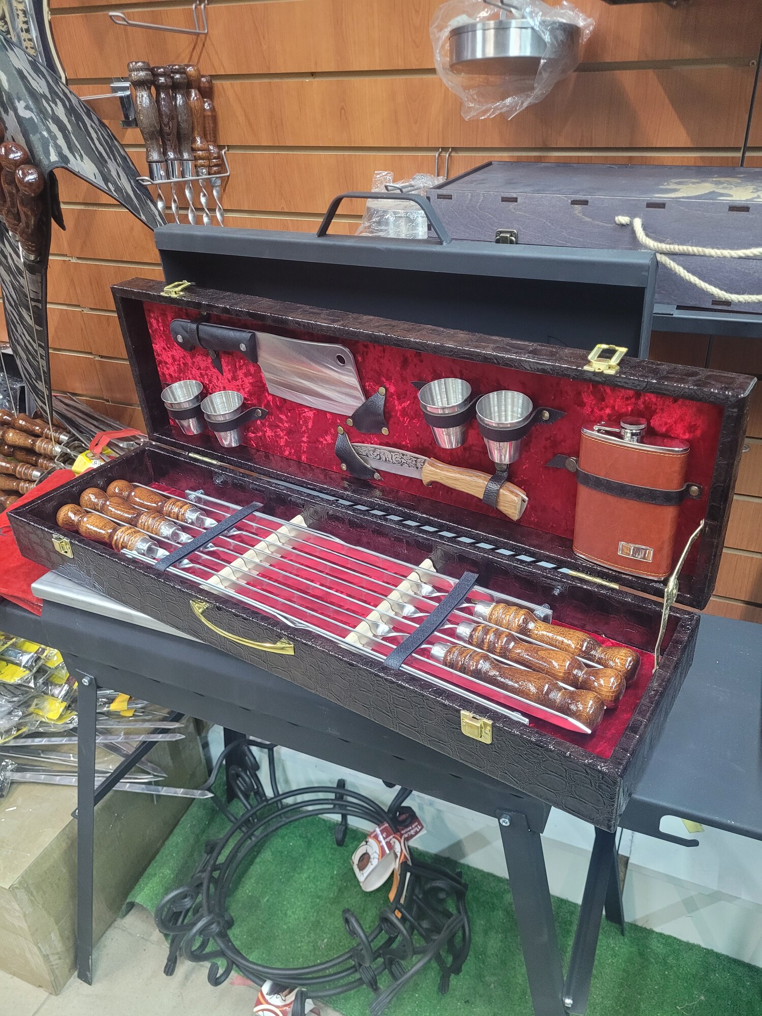 | Комплектация | Шампуры 6 шт , Мангал полевой , Нож , Топорик разделочный , Фляжка , Стопки 4 шт , Нож перочинный , Зажигалка патрон , Фонарик |