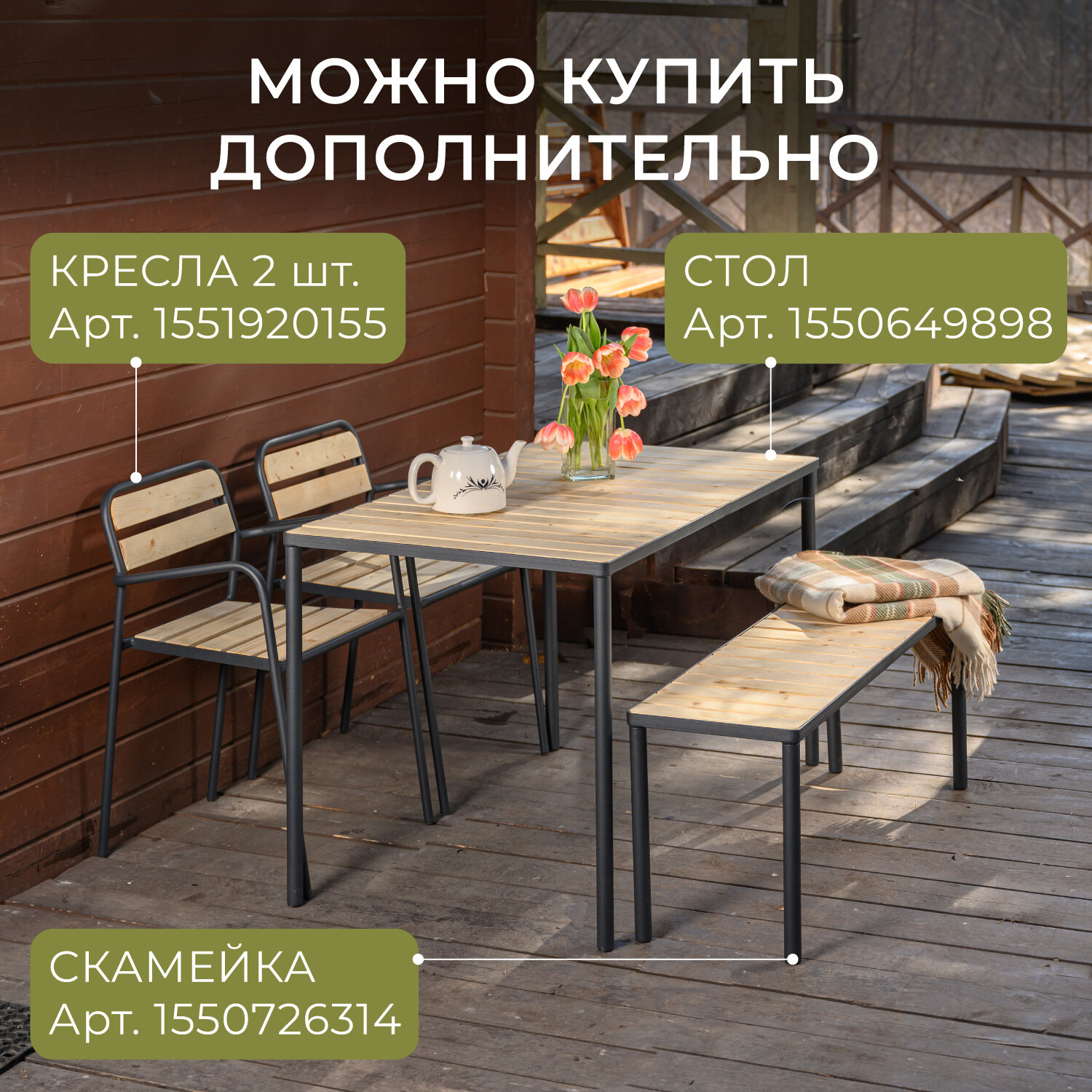 | Дополнительная информация | Древесина - сосна с водоотталкивающей пропиткой, каркас - металл с полимерным покрытием, устойчивым к ржавчине и царапинам |