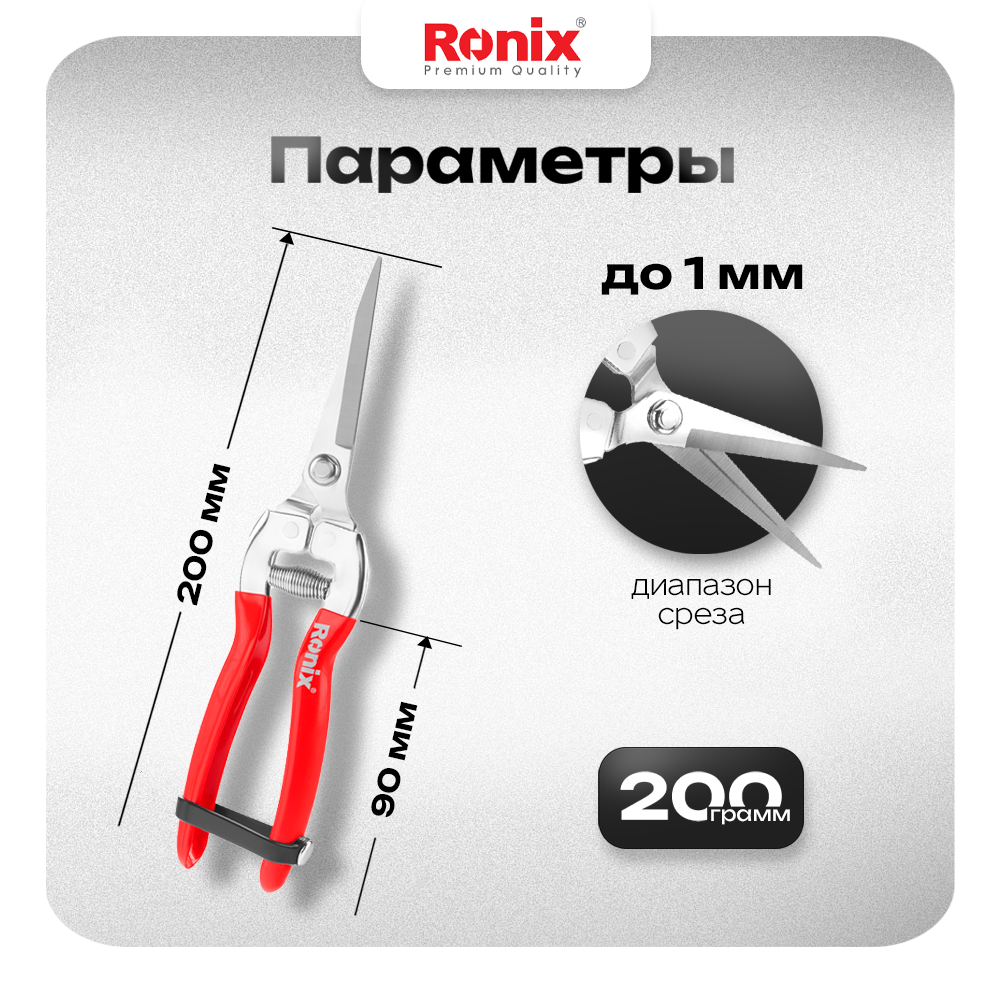 Секатор для цветов, ножницы садовые универсальные Ronix 200 мм диапазон реза до 1 мм, японская сталь 599 ₽