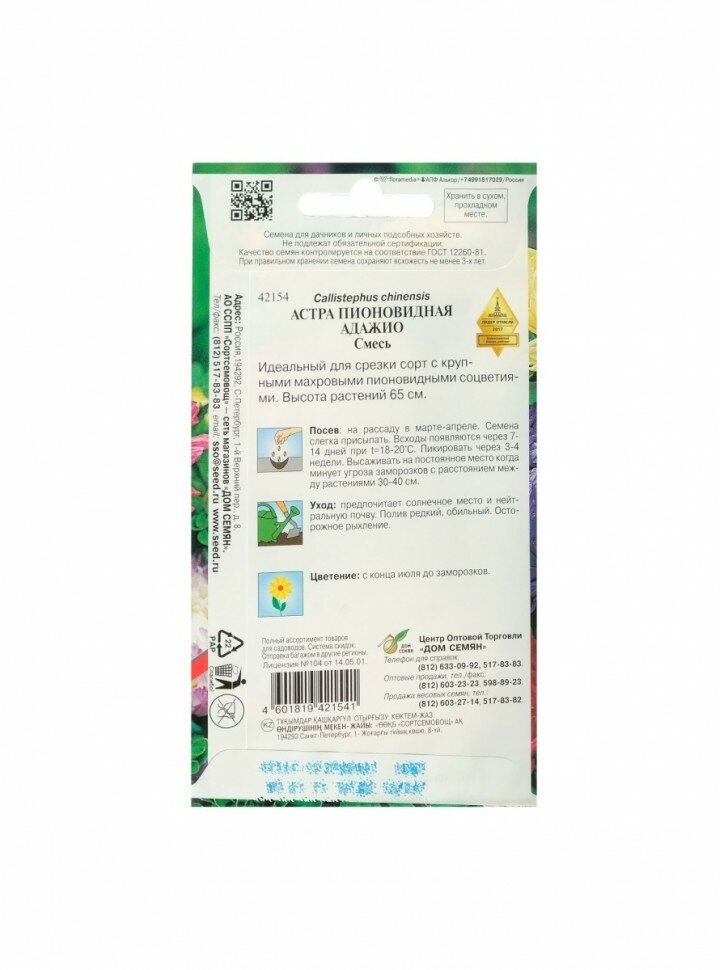 Семена цветов Астра пионовидная "Адажио" Дом семян, смесь, О, 90 шт информация: