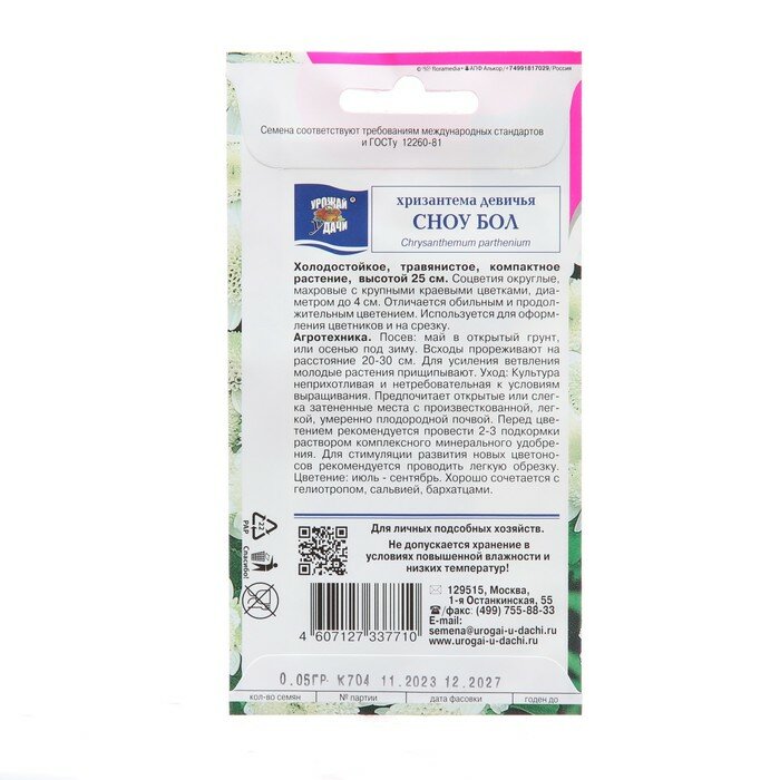 Семена цветов Хризантема девичья "Сноу Бол", 0,05 г информация: