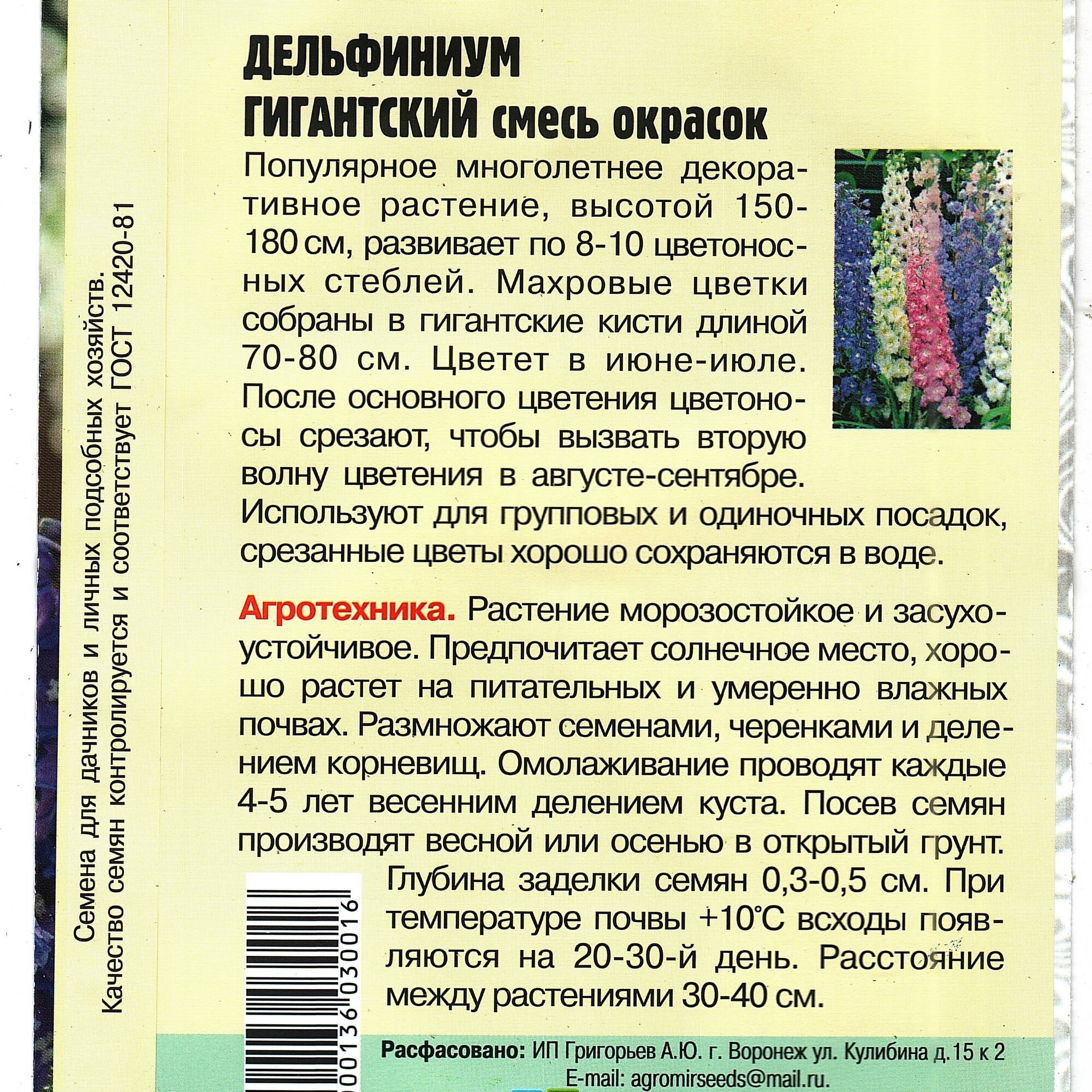 Дельфиниум Гигантский, смесь окрасок, многолетник ( 1 уп: 50 семян ) информация: