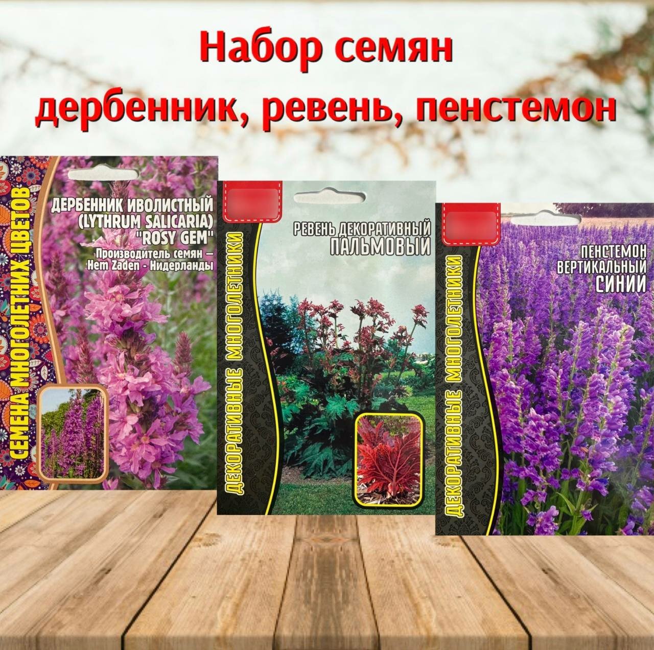 Семена многолетних цветов для сада Дербенник, Пенстемон, Ревень. Набор 3 упаковки информация: