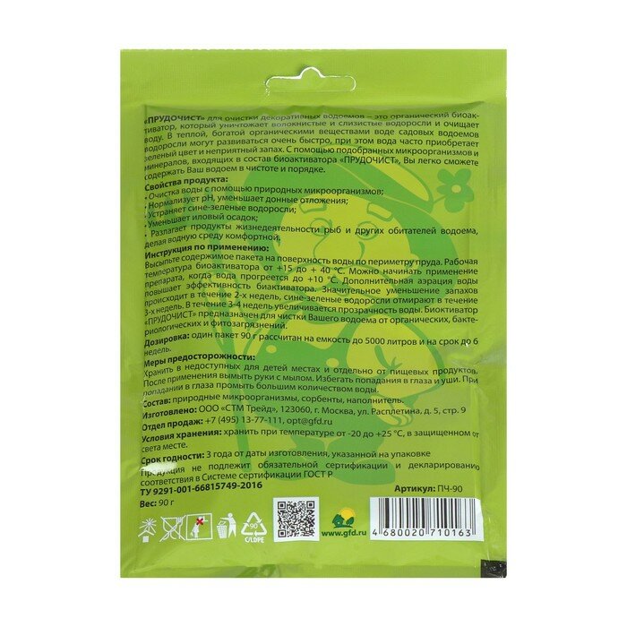 Биологическое средство для чистки декоративных прудов и фонтанов «Прудочист», 90 г. информация: