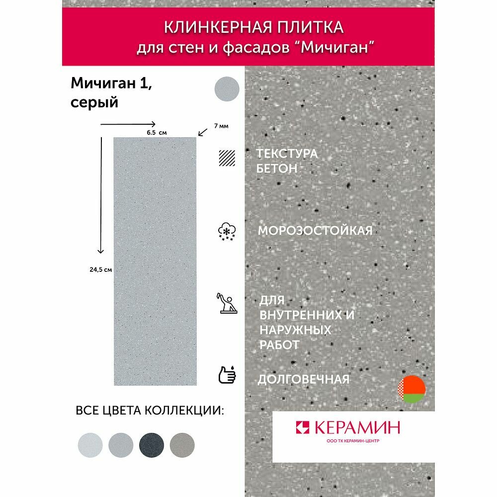 Плитка клинкерная Керамин Мичиган 1 серый 24.5x6.5 см (34 шт 0.54 м2) информация: