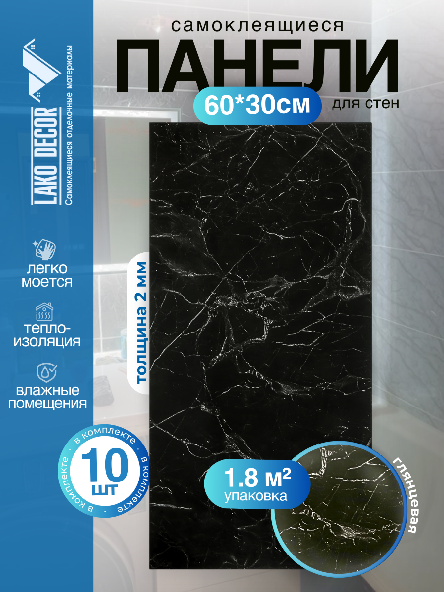 Отзывы на Мини Комплект 10шт Самоклеящаяся ПВХ плитка LAKO DECOR "глянец черный мрамор", толщина 2мм, 1,8м²