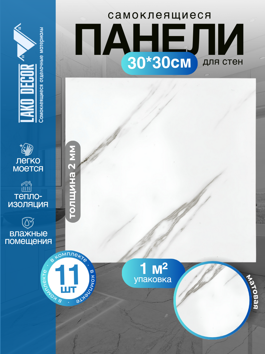 Мини Комплект 11шт Самоклеящаяся ПВХ плитка LAKO DECOR "Белый мрамор", толщина 2мм, 1м² 1 499 ₽