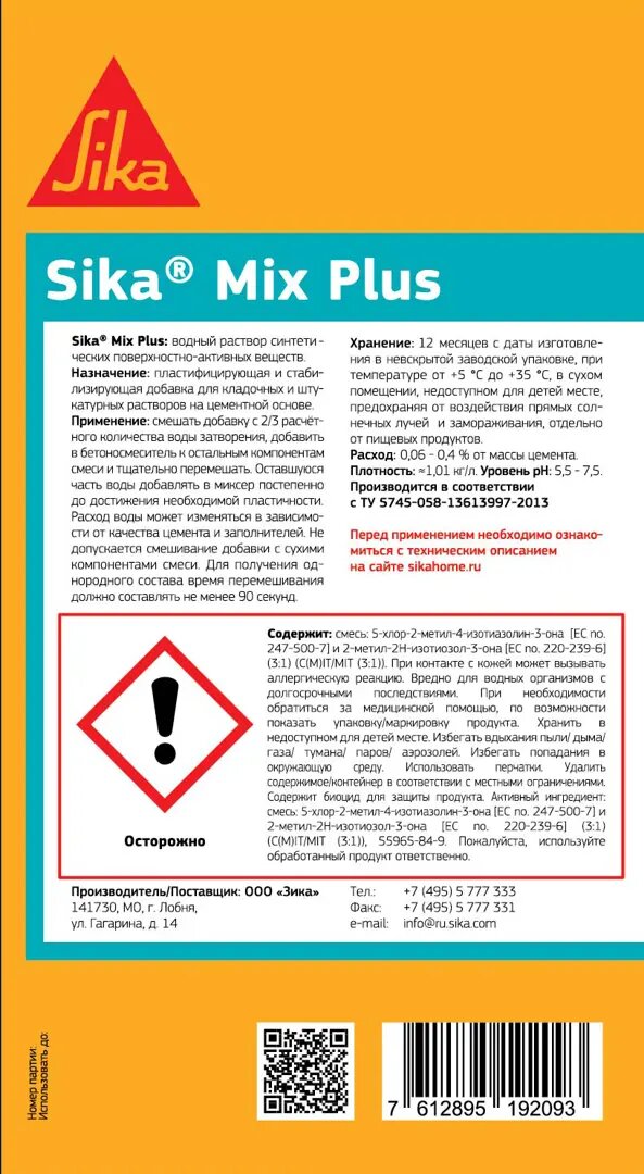 | Дополнительная информация | Пластификатор для растворов Sika Mix Plus, 0.9 л |