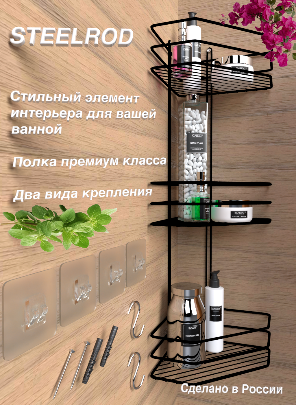 | Комплектация | полка для ванной - 1 шт; крепеж (саморез и дюбель) - 2 шт; крепеж (силиконовые крючки) - 2 шт; картонная коробка - 1 шт |