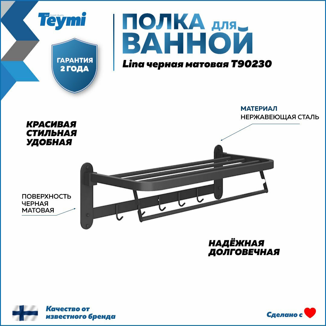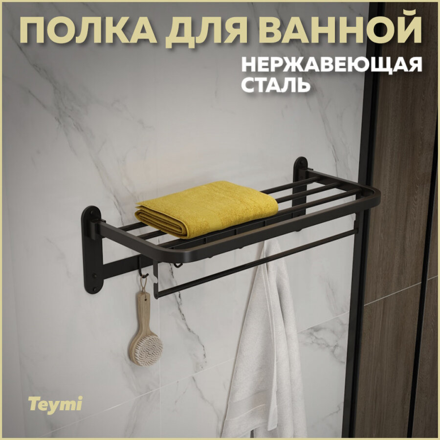 Полка для ванной Teymi Lina с крючками для полотенец, нержавеющая сталь, черная матовая T90230 информация: