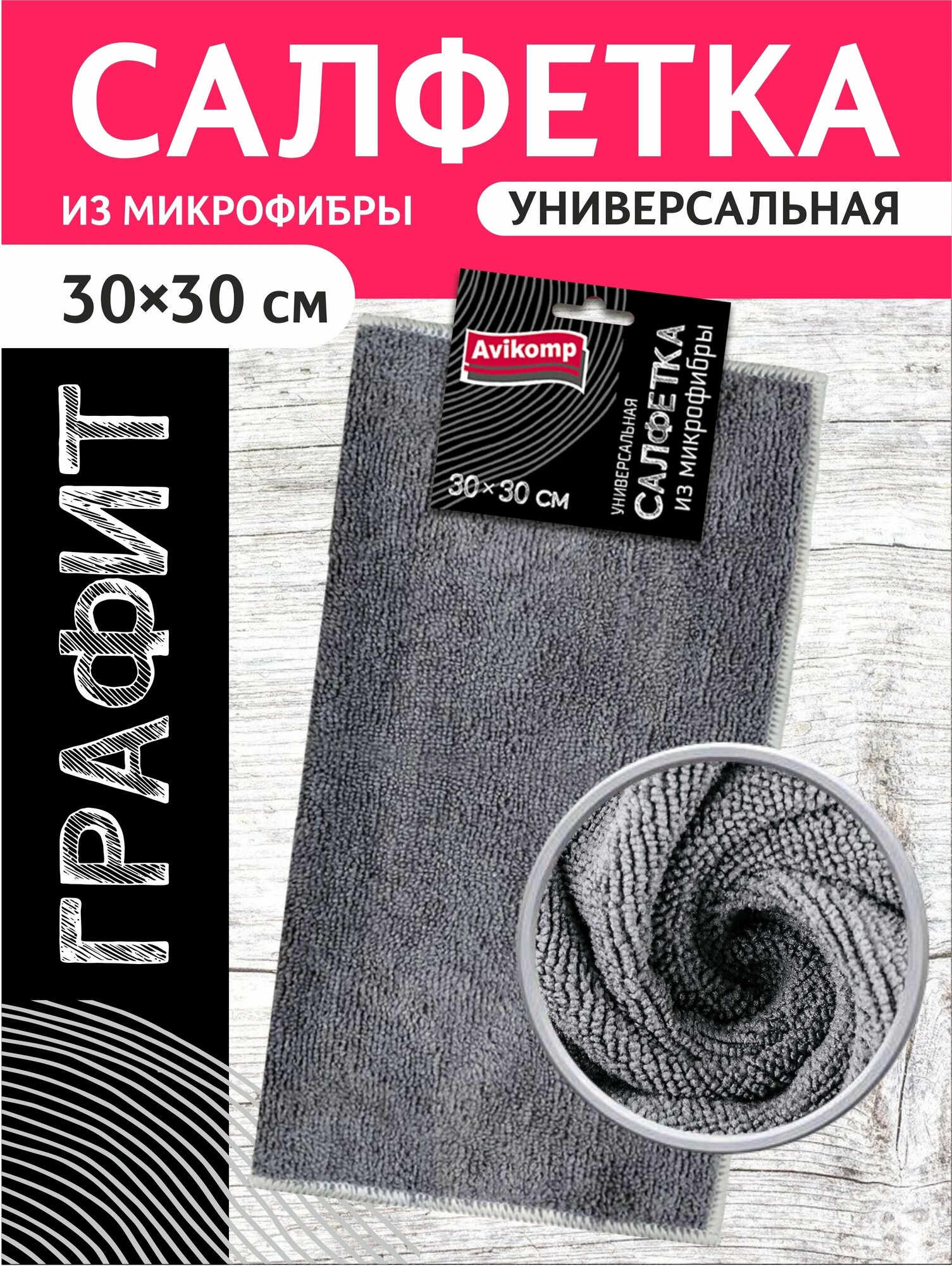 Салфетка универсальная из микрофибры графит, Avikomp, 30х30см, 1шт, серая информация: