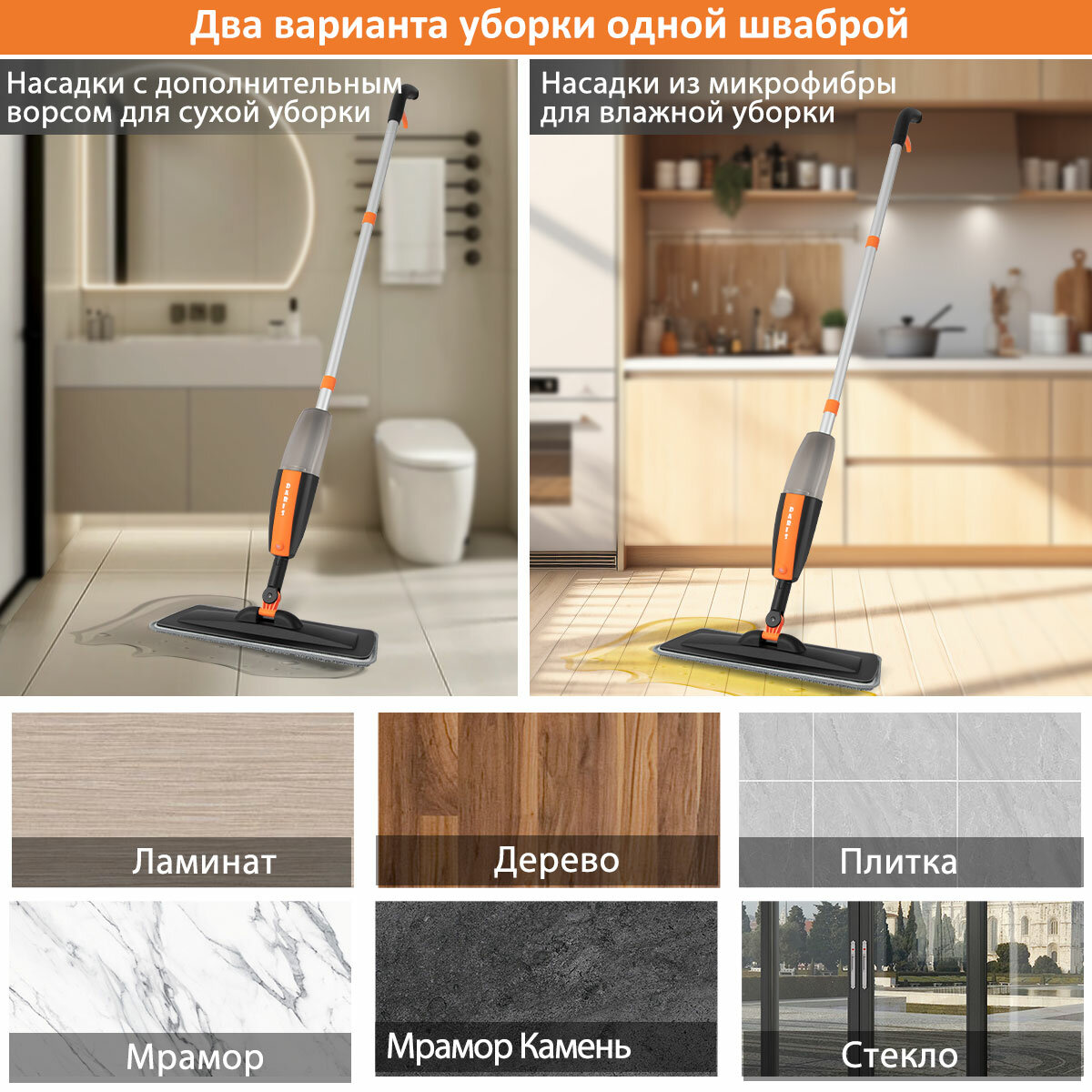 10 цен на Черно-оранжевая швабра с распылителем, 3 насадки.